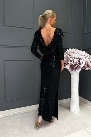 Elegantne, sädelevast kangast kehasse hoidev pikkade varrukatega õhtukleit, mis toob esile kandja figuuri ja lisab pidulikkust. Kleiti saab kanda kahel viisil – kas avatud dekoltee või efektse seljaosaga –, pakkudes võimalust luua vastavalt soovile ja sündmusele erinevaid ilmeid.