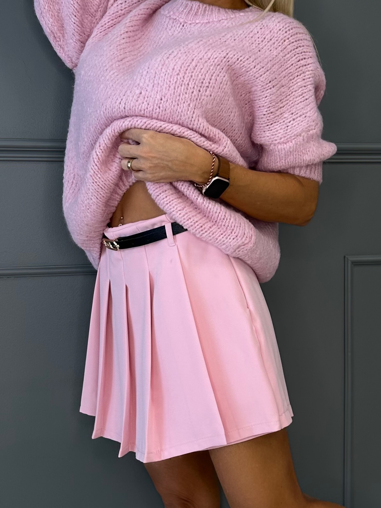 Komplekti kuuluv vöö rõhutab taljet ja lisab outfitile viimistletud ilme. Püksseelik on ilma taskuteta, mis tagab sujuva ja minimalistliku joone. Saadaval kolmes ajatus värvitoonis – must, roosa ja helebeež –, mis sobituvad hõlpsasti erinevate toppide ja bleiseritega.