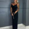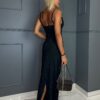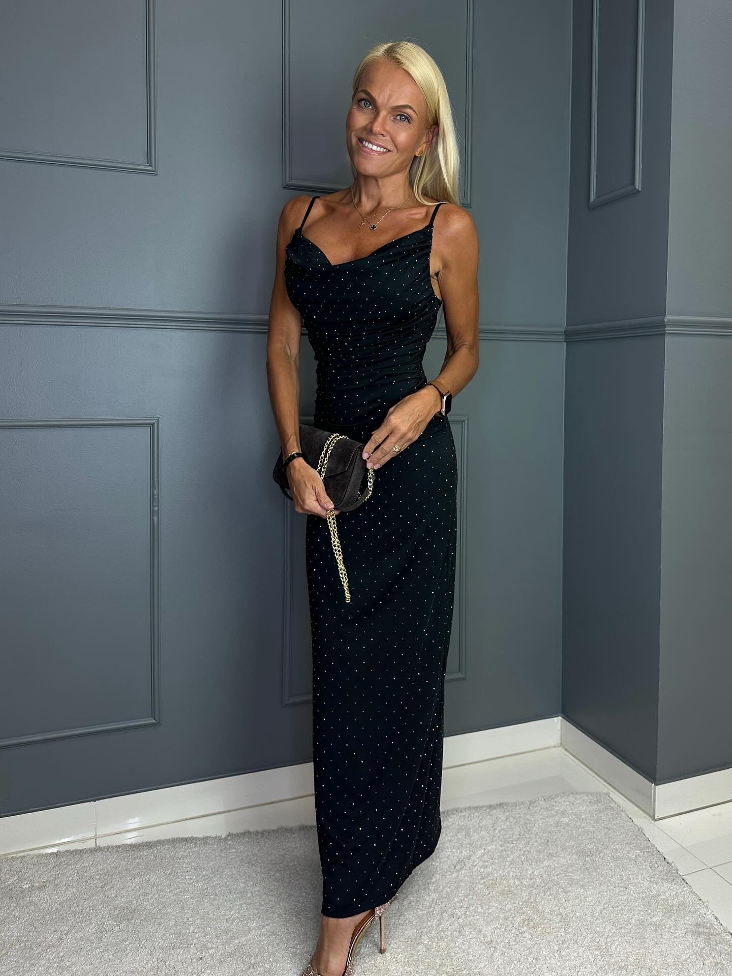 Kleit on valmistatud venivast materjalist, mis tagab mugavuse ja sobivuse erinevatele kehakujudele. Kangas on kaetud väikeste sädelevate kivikestega, lisades luksuslikku sära igale liigutusele.