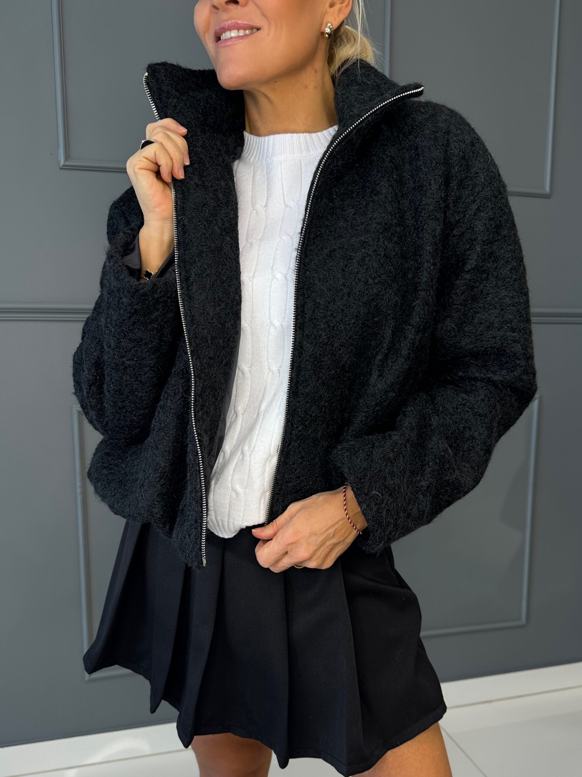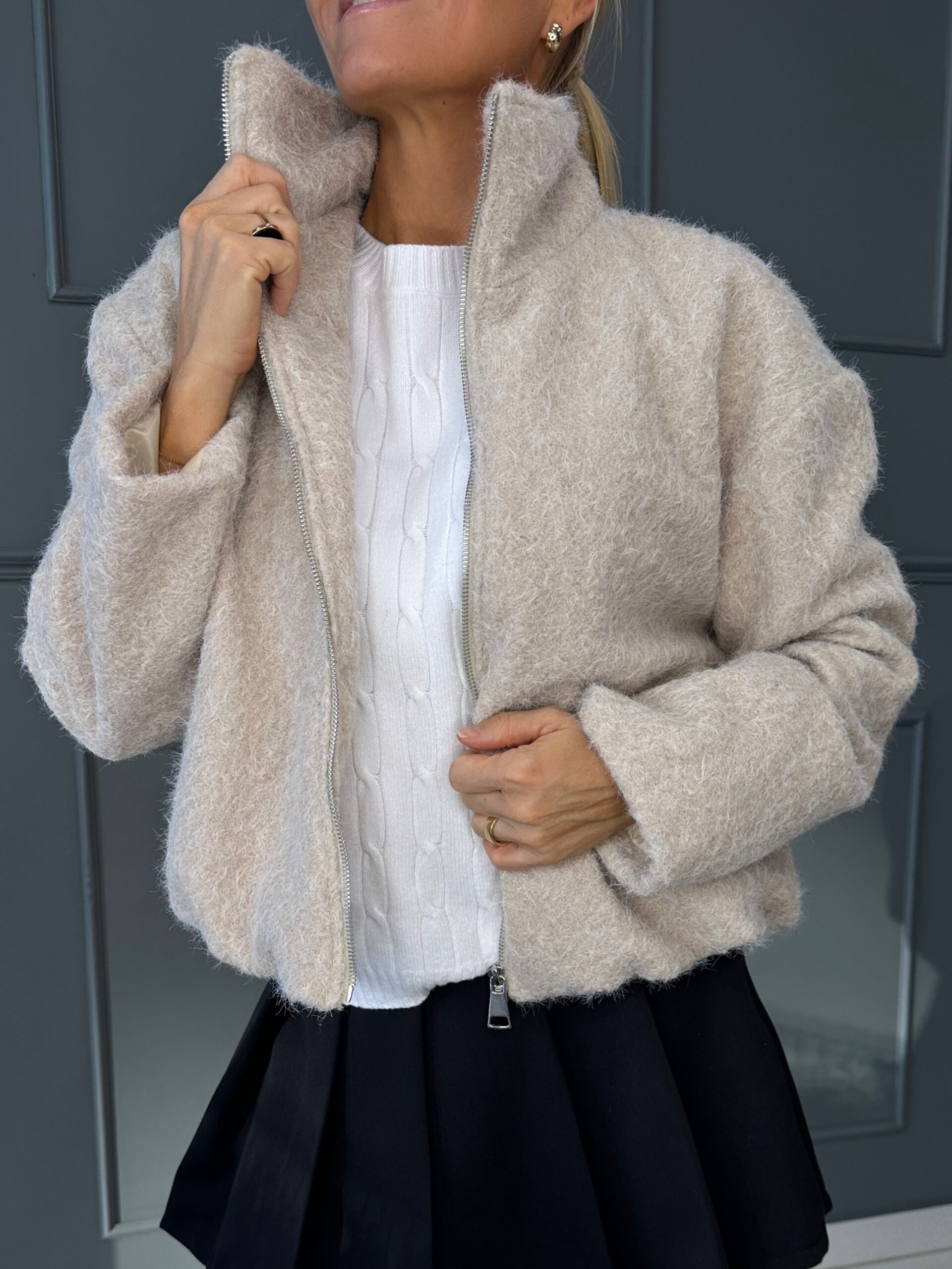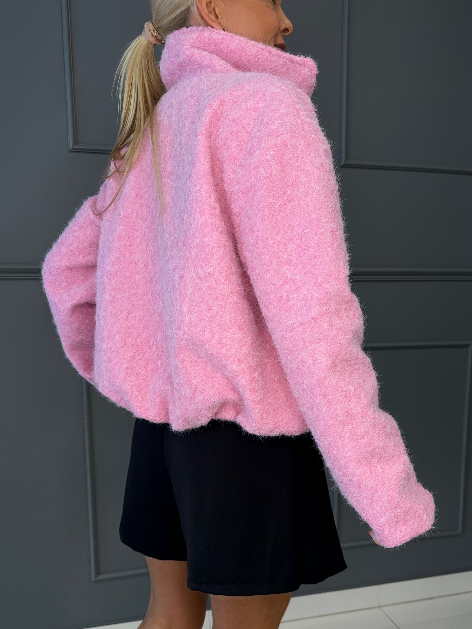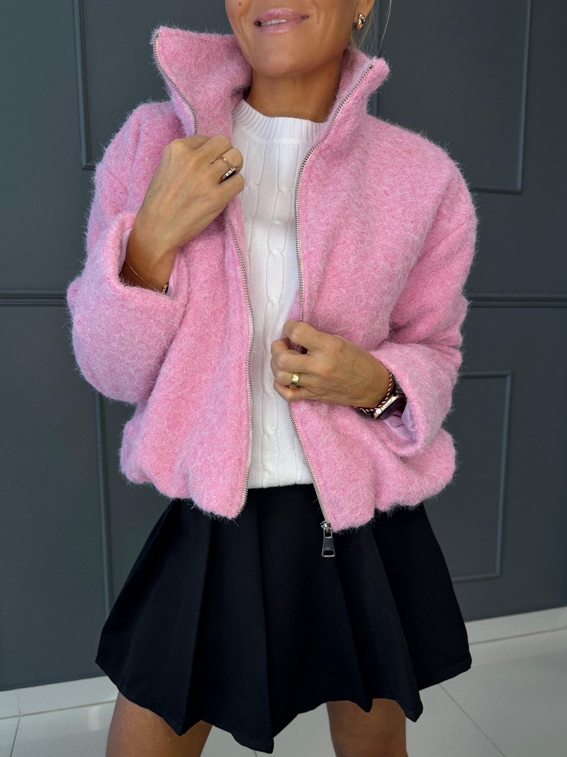 Jakk on seestpoolt õhukese voodriga, pakkudes piisavalt soojust kevadeks, jahedamateks suveõhtuteks ja varasügiseks. Saadaval kolmes universaalses toonis – roosa, must ja beež –, mis sobituvad hõlpsasti teksade, kleitide ja pükstega.