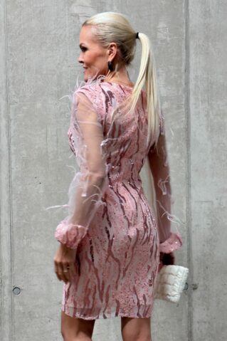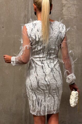 Гламурное платье длины мини, переливающееся блестками и очаровывающее своими тюлевыми рукавами и деталями из перьев. Смелое и привлекающее внимание, это платье создано для привлечения внимания, идеально подходит для торжественных случаев и особых вечеров. Украшения из перьев придают платью уникальный и модный вид, благодаря которому вы будете выделяться в любой толпе.