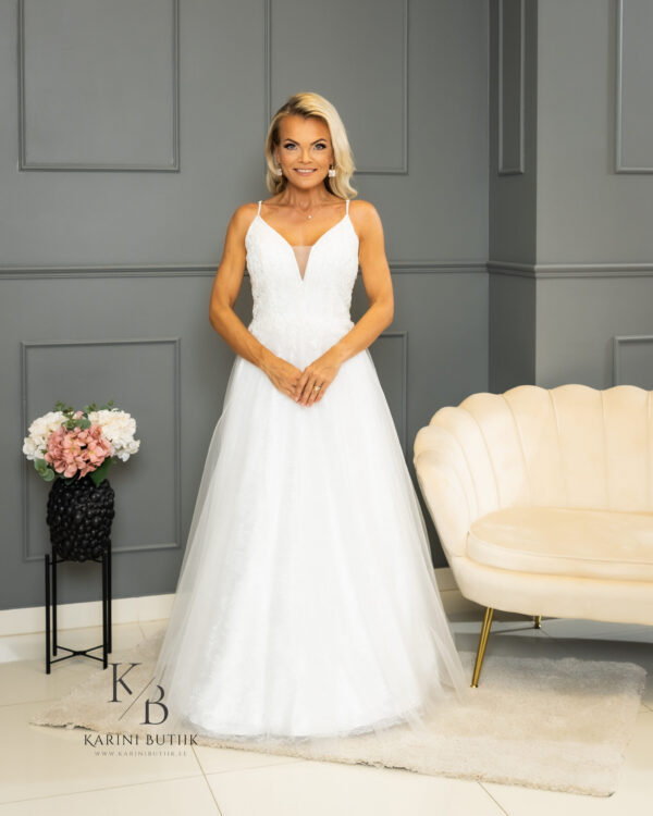 Станьте центром свадебного дня вашей мечты с нашим очаровательным свадебным платьем Bergamo, мастерски созданным из нежного тюля, тонких бретелей и кружевной подкладки. Это платье - идеальный выбор для невесты, которая хочет излучать элегантность и романтику.
