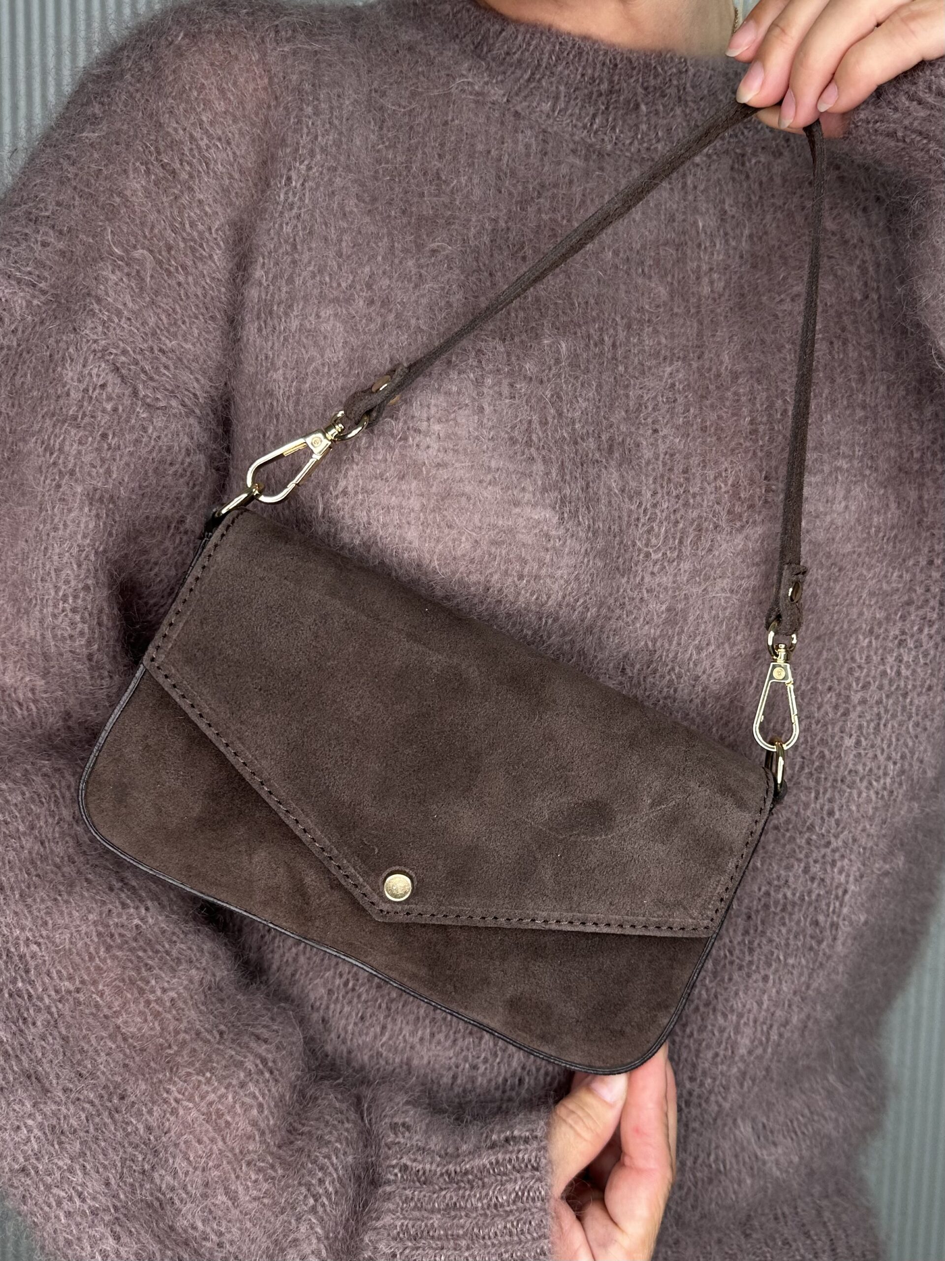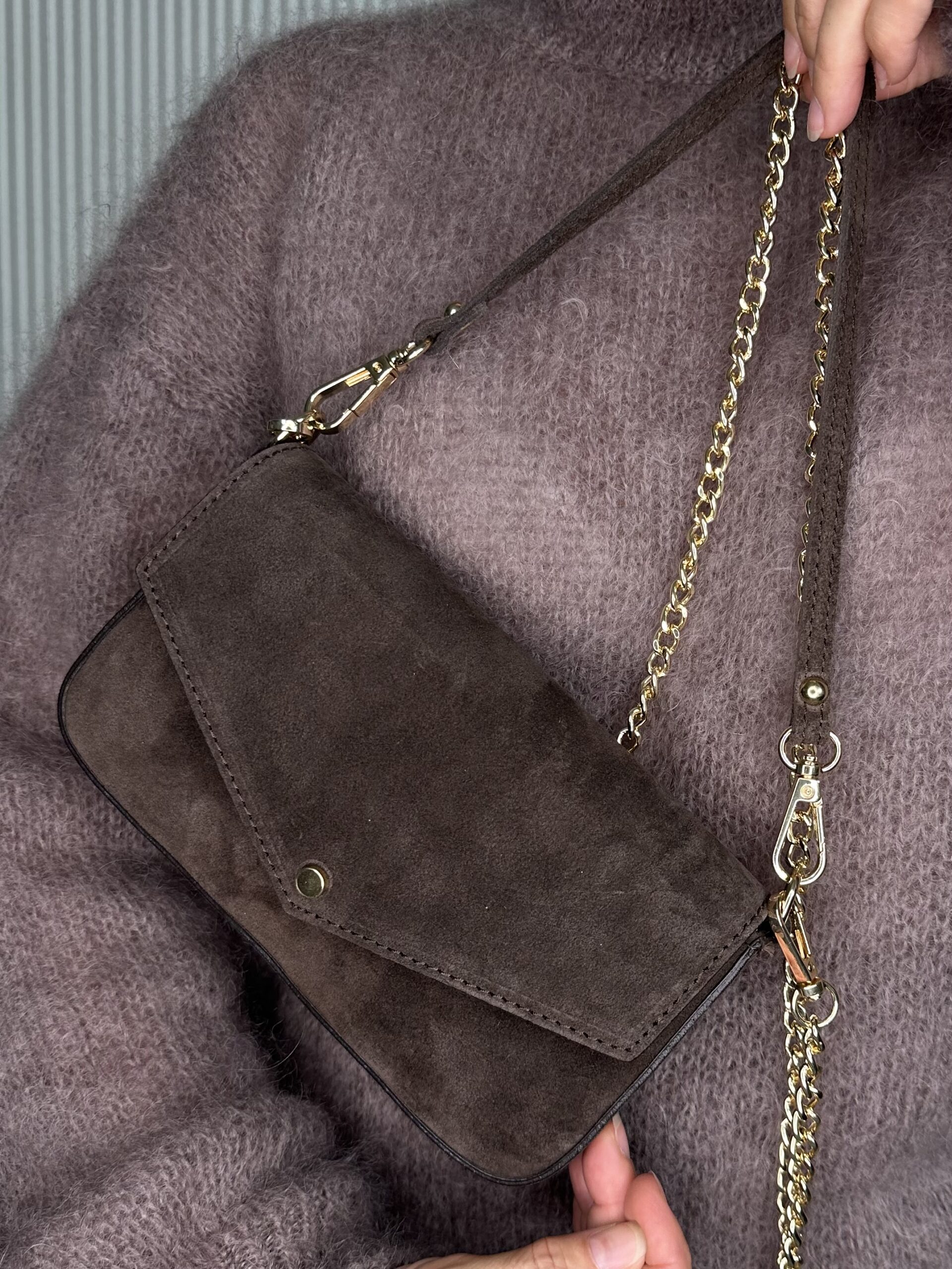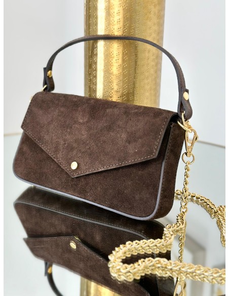 Elegantne ja ajatu pruun käekott, valmistatud kvaliteetsest naturaalsest seemisnahast. Kott sobib suurepäraselt nii argipäevaks kui pidulikumateks sündmusteks. Komplektis on eemaldatav pikk õlarihm kuldsest ketist, mis võimaldab kanda kotti ka üle õla või risti kehal. Käekotil on tugev lühike sang ning esiküljel klapiga sulgemine metallnööbiga. Täiuslik valik stiilsele naisele, kes hindab luksuslikku materjali ja praktilisust.