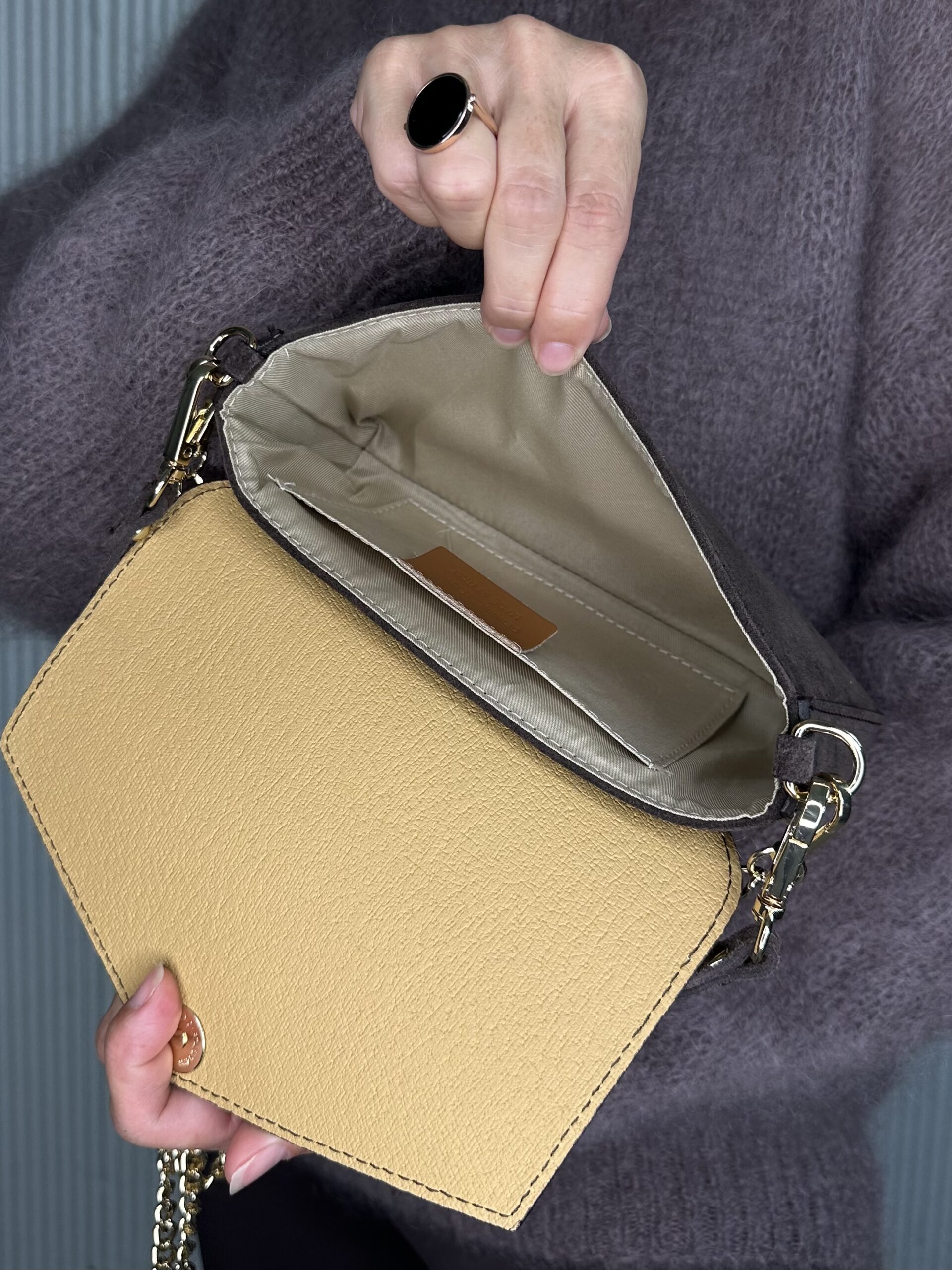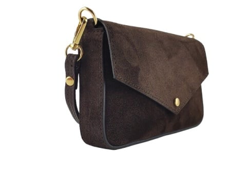 Naturaalsest seemisnahast pruun käekott kuldse ketirihmagaNaturaalsest seemisnahast pruun käekott kuldse ketirihmaga