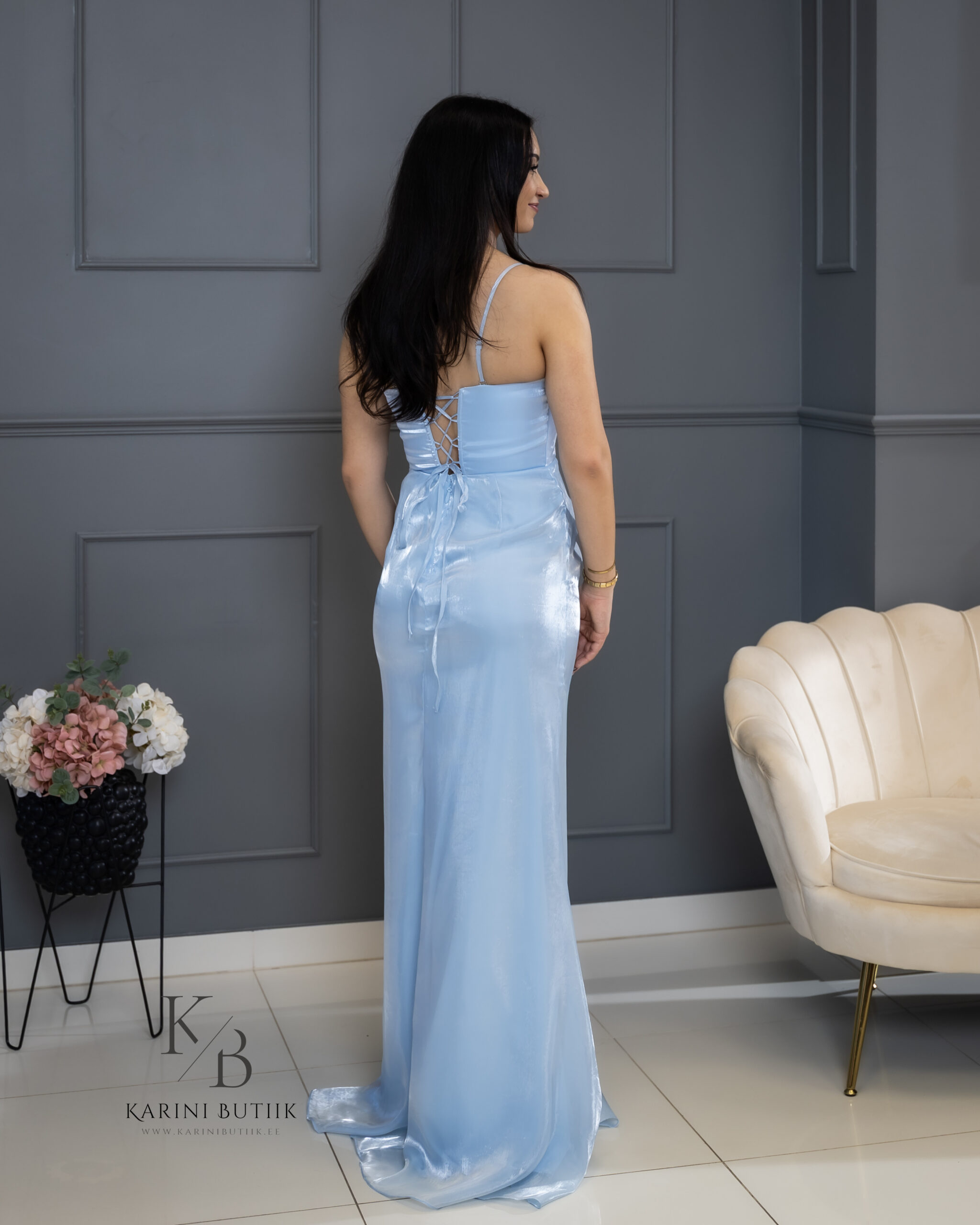 Kleidil on peened õlapaelad, kaunilt figuuri järgiv lõige ning luksusliku ilmega õrnalt läikiv kangas, mis annab üldmuljele pidulikkust ja pehmust. Eriliseks detailiks on seljaosas korsetipaeltega kinnitus, mis aitab istuvust paremini kohandada ning lisab kleidile romantilise ja naiseliku aktsendi.