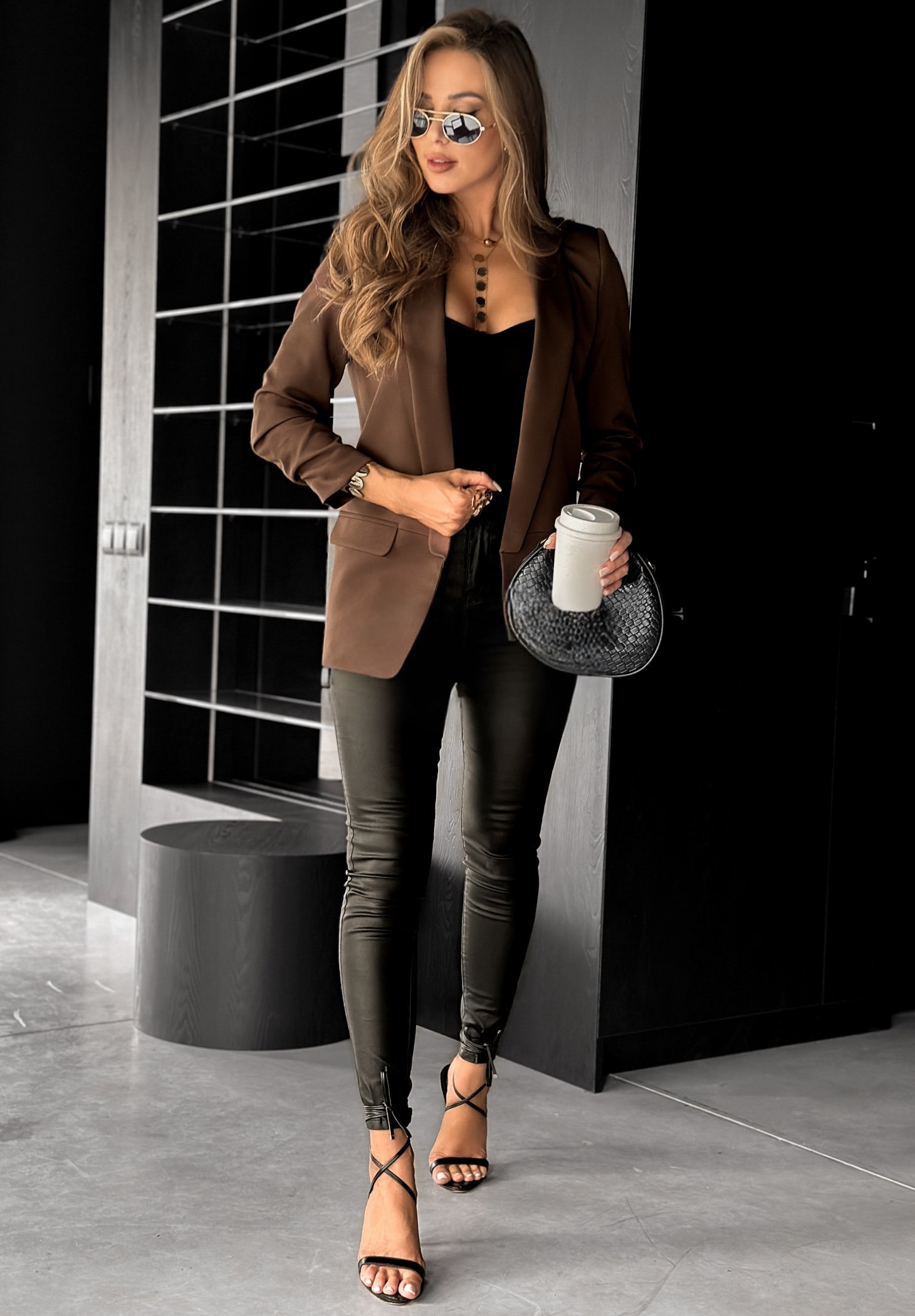 Elegantne ja kaasaegne kolmveerandvarrukatega pintsak, mis lisab igale outfit’ile šikki viimistluse. Valmistatud kvaliteetsest kangast, mis hoiab hästi vormi ja tagab mugava istuvuse. Tumepruun toon on universaalne ja ajatu – sobib nii tööle, üritustele kui igapäevaseks kandmiseks. Minimalistlik lõige, avatud esiosa ja hoolikalt viimistletud detailid muudavad selle pintsaku hooaja must-have esemeks. Saadaval suurustes S–XL.