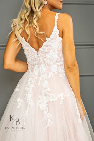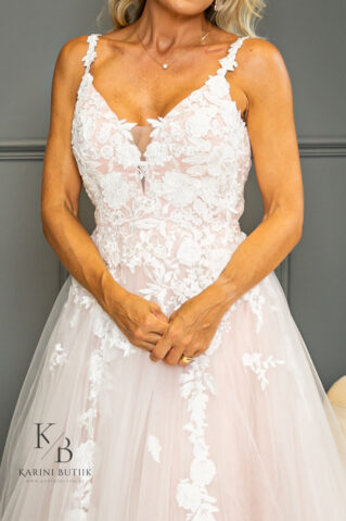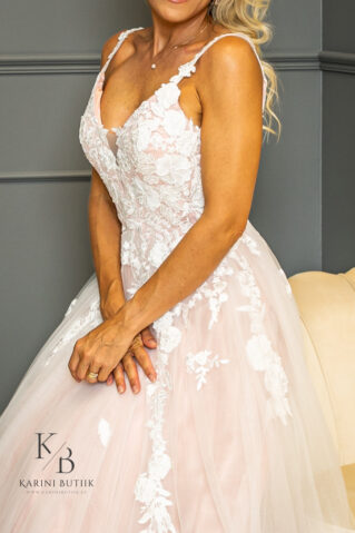 Основная ткань платья - нежно-розовая, которая добавляет тонкий слой цвета, но при этом достаточно сдержанна, чтобы сохранить традиционный вид свадебного платья. Верхний слой тюля украшен нежной цветочной вышивкой, которая подчеркивает уникальный дизайн платья и придает ему романтическую нотку. Вышивка мастерски выполнена с изображением цветков лилии, символизирующих чистоту и красоту.