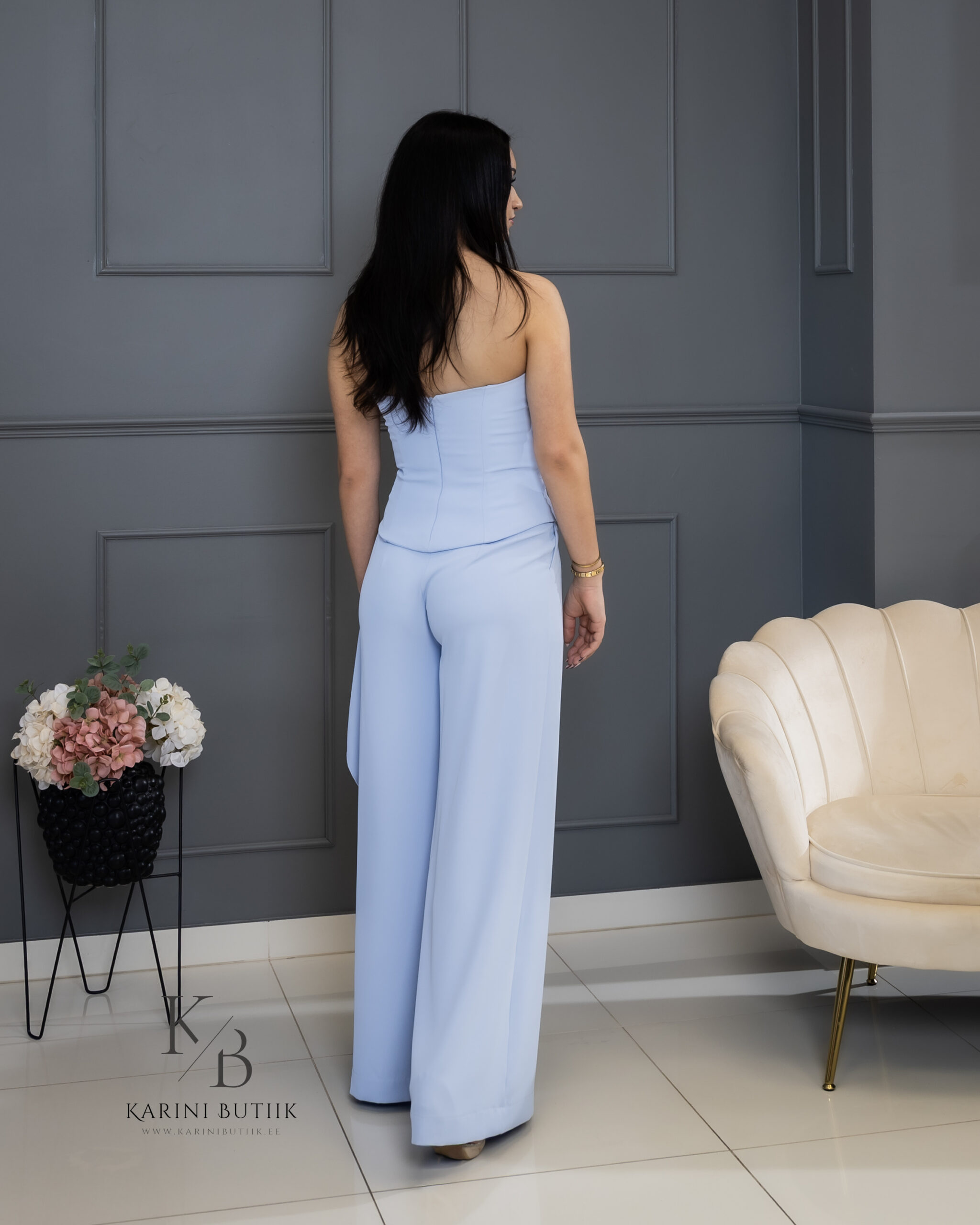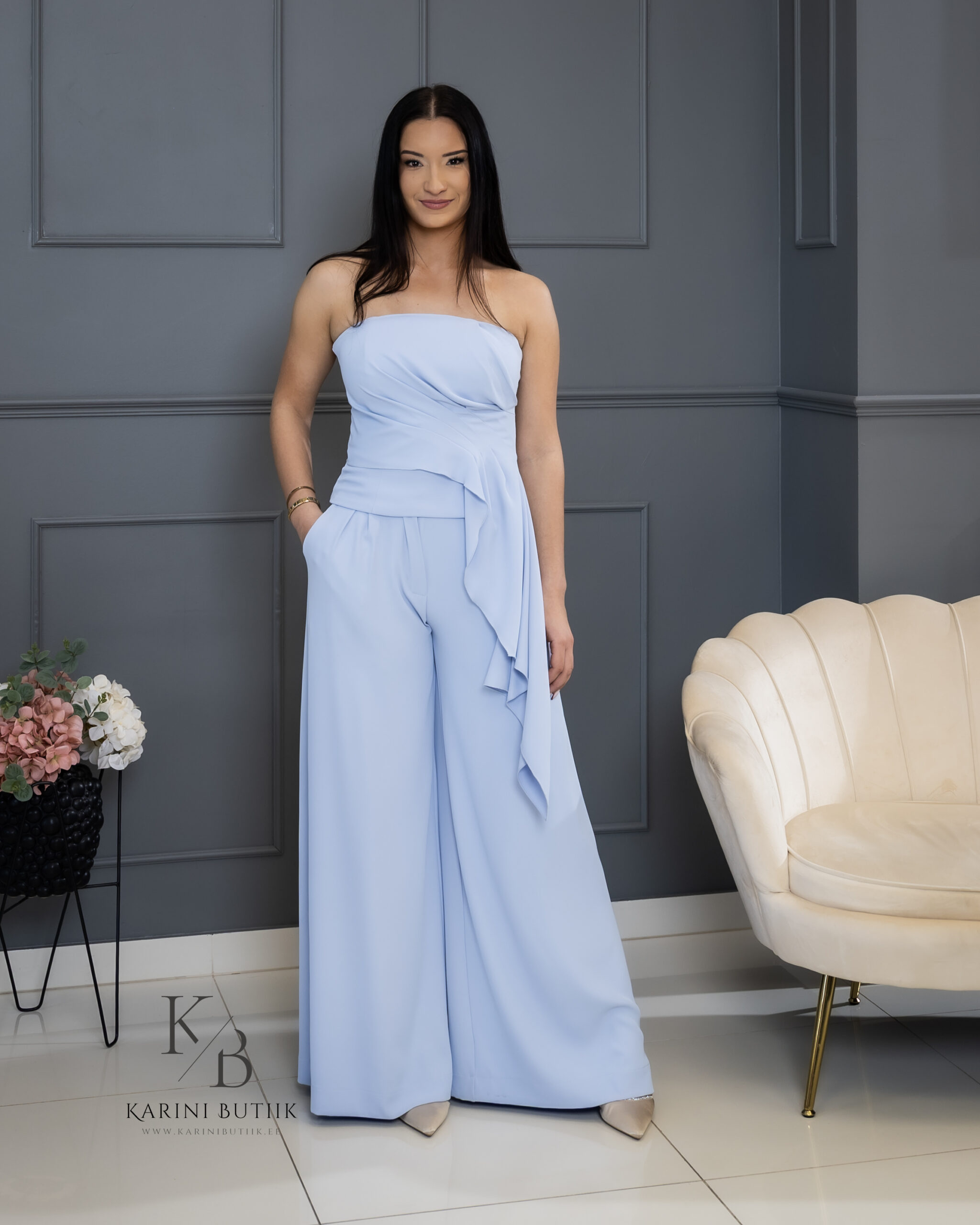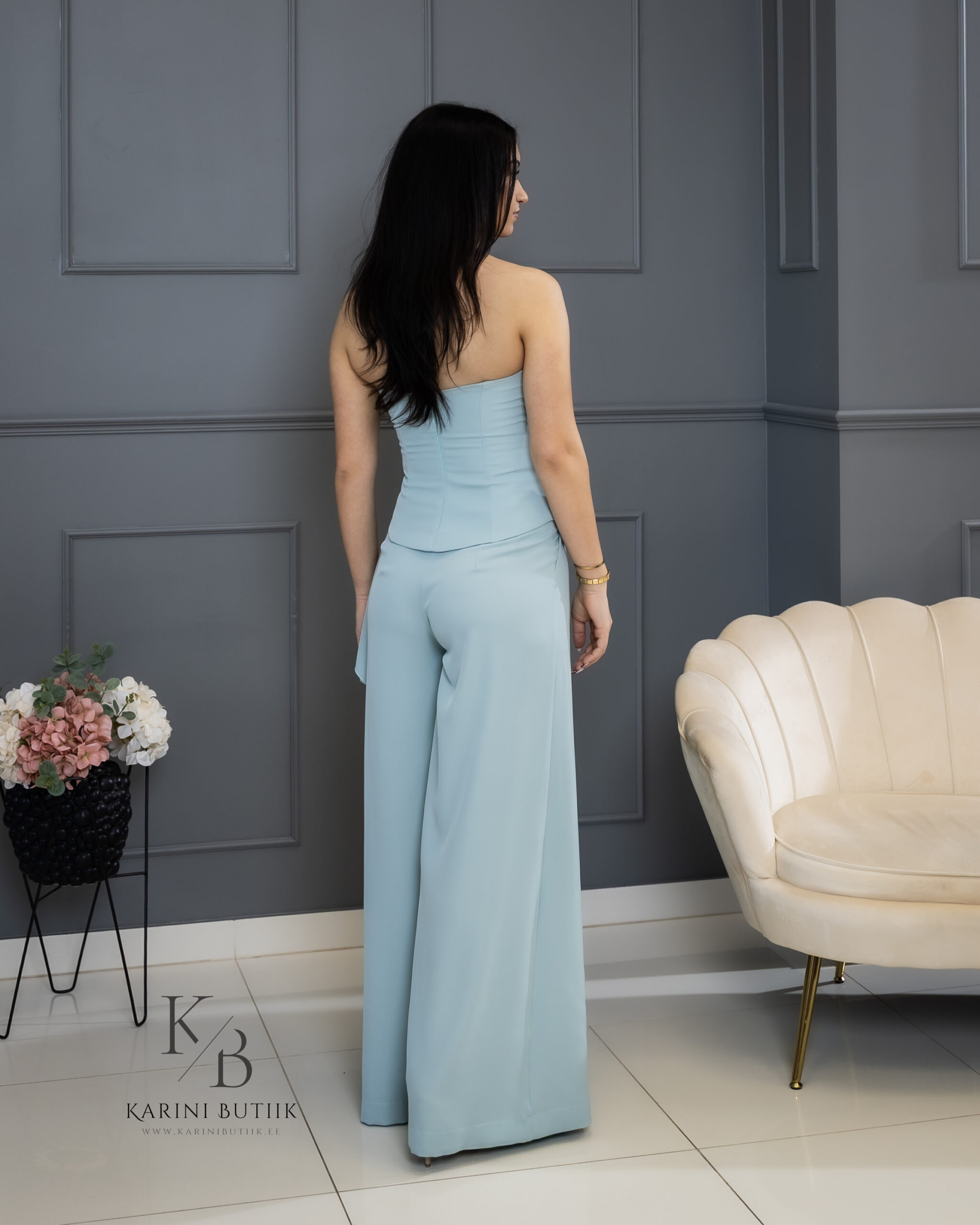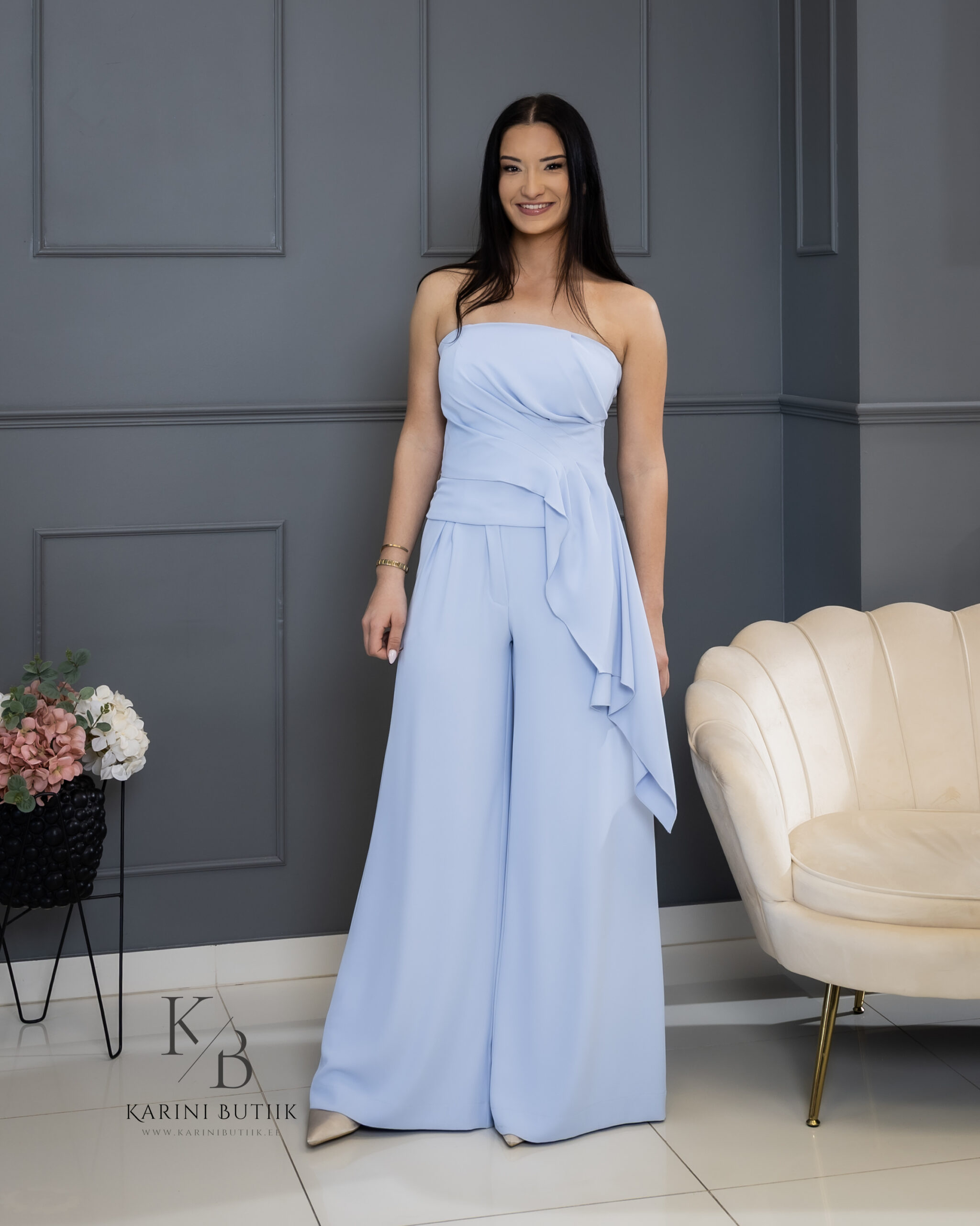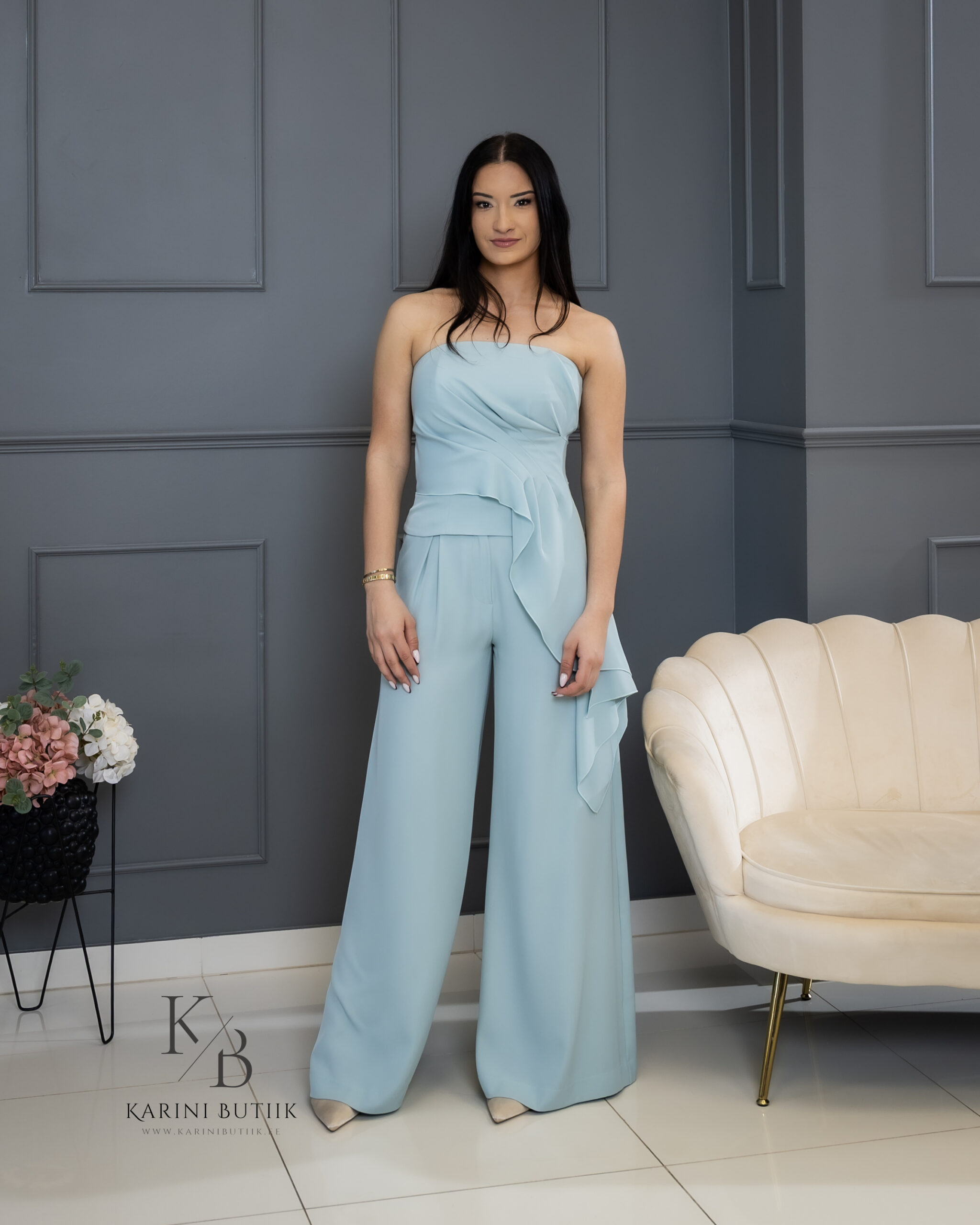 Pluusi eriliseks detailiks on kaunis langevus ning seljalt peitlukuga kinnitus, mis tagab puhta ja viimistletud ilme. Vabalt langev materjal muudab kostüümi kandmise mugavaks ning annab sellele luksusliku ja voogava üldmulje. Püksid on avara ja elegantse lõikega, mistõttu sobib see komplekt suurepäraselt nii pidulikuks sündmuseks, peoks kui ka eriliseks tähistamiseks.