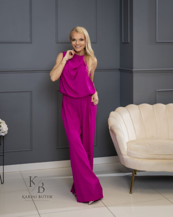 Väga mugav ja vabalt langev kangas muudab selle pükskostüümi ideaalseks valikuks nii pidulikuks sündmuseks, suveürituseks kui ka šikiks igapäevaseks kandmiseks. Saadaval kahes kaunis toonis — fuksia ja helesinine. Suurused S ja M.