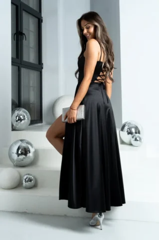 Avasta luksuslik korsettlõikega maksikleit, mis rõhutab figuuri ja pakub maksimaalset elegantsi. Kleidi alt laienev lõhikuga seelikuosa lisab liikumisele kergust ja suursugusust. Seljal korsetile iseloomulikud pingutuspaelad võimaldavad täiuslikku sobivust, samas kui topelt õlapaelad lisavad sensuaalsust ja ainulaadset stiili. Valmistatud satiinkangast, mis tagab luksusliku sära ja mugavuse. Ideaalne valik pidulikeks sündmusteks, pulmadeks või õhtusöökideks, kus soovid särada. Saadaval erinevates suurustes ja värvitoonides.