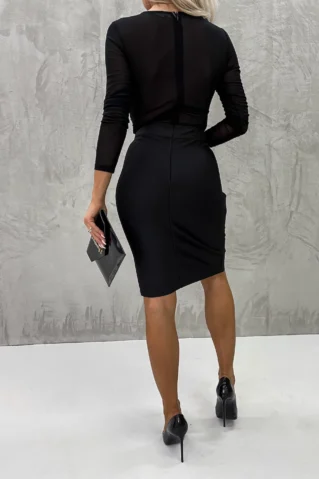 Pilkupüüdev kleit, mille seelikuosa on valmistatud kehakujusid rõhutavast bandage-materjalist. Kleidi rinnaosa on kaunistatud läikivate litritega, mis lisavad sära ja elegantsi. Läbipaistvad venivast kangast varrukad lisavad naiselikku ja õrna puudutust, luues trendika ja šiki välimuse.