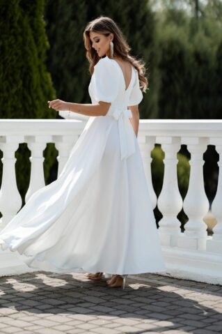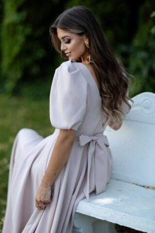 Elegantne maksikleit, millele annavad iseloomu lühikesed puhvvarrukad ja naiselik siluett. Kleidi seljal seotav vöö toob esile talje ning lisab efektse ja viimistletud ilme. Ideaalne valik nii pidulikeks sündmusteks kui ka stiilseks igapäevaseks kandmiseks.