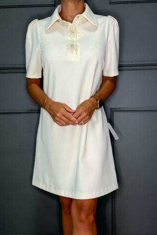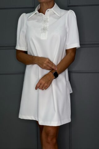 Võluv ja naiselik A-lõikeline kleit, mis köidab pilku suure krae ning õrna lillekaunistusega esiosal. Lühikesed puhvvarrukad lisavad romantilist hõngu, samas kui avar lõige tagab liikumisvabaduse ja kandmismugavuse. Elegantne ja mitmekülgne mudel sobib ideaalselt nii pidulikeks sündmusteks kui ka kevad- ja suvepäevadeks. Saadaval kolmes kaunis toonis: heleroosa, klassikaline valge ja õrn kollakas-beež. Suurused S, M ja L. Kleidil küljel peitelukk.