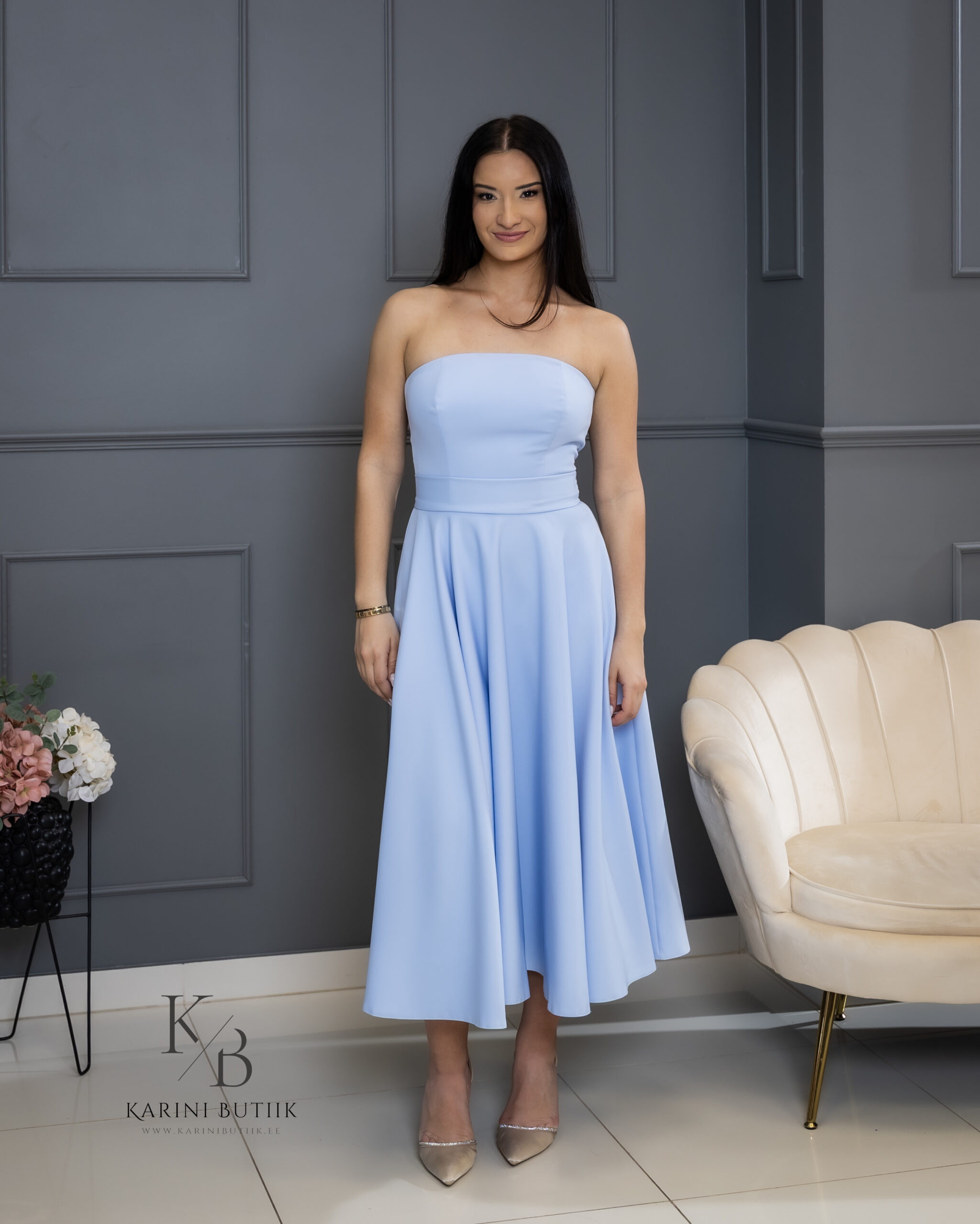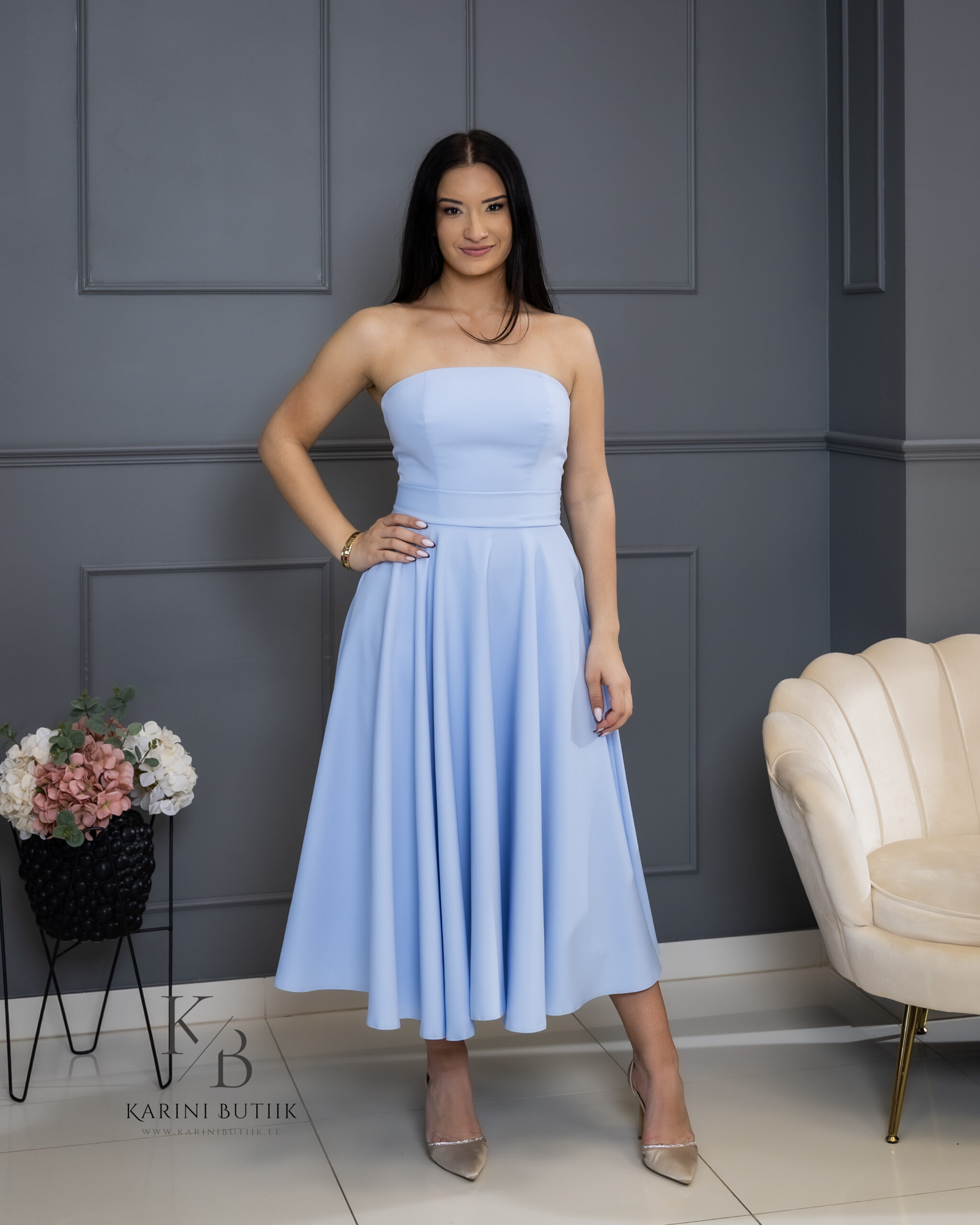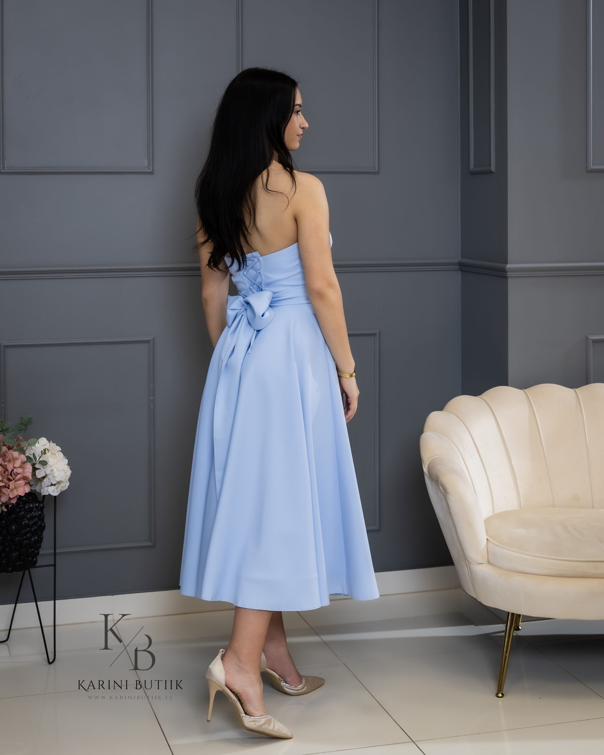 Karini Butiigi elegantne midikleit on naiselik ja pilkupüüdev valik pidulikuks sündmuseks, suvepeoks, lõpetamiseks või eriliseks tähistamiseks. Kleidil on kaunis figuuri rõhutav ülaosa, lendlev midi pikkuses seelik ning romantiline seljaosa korsetipaeltega, mis lisab kleidile luksusliku ja õrna aktsendi.