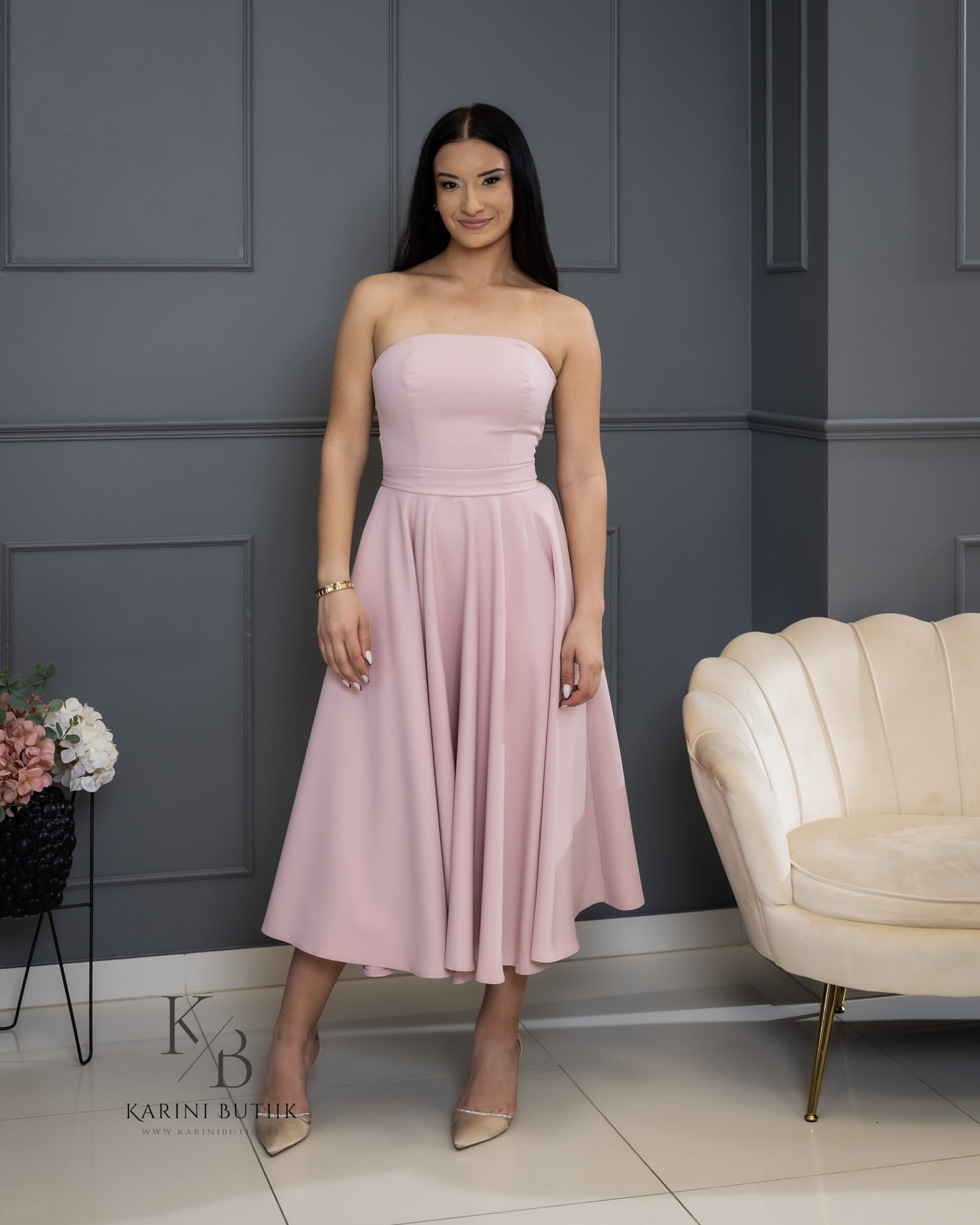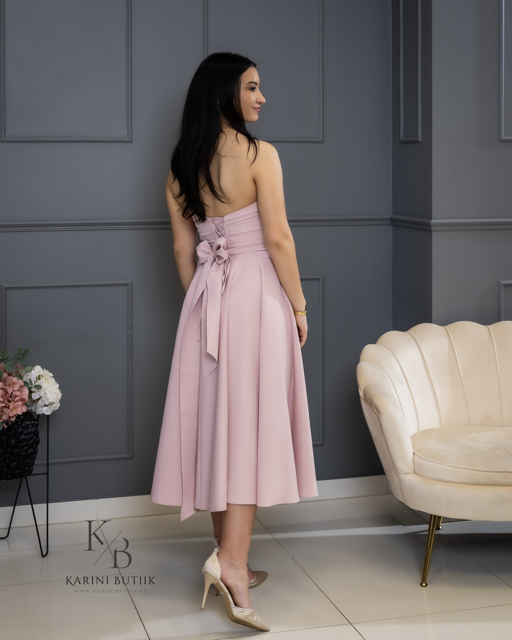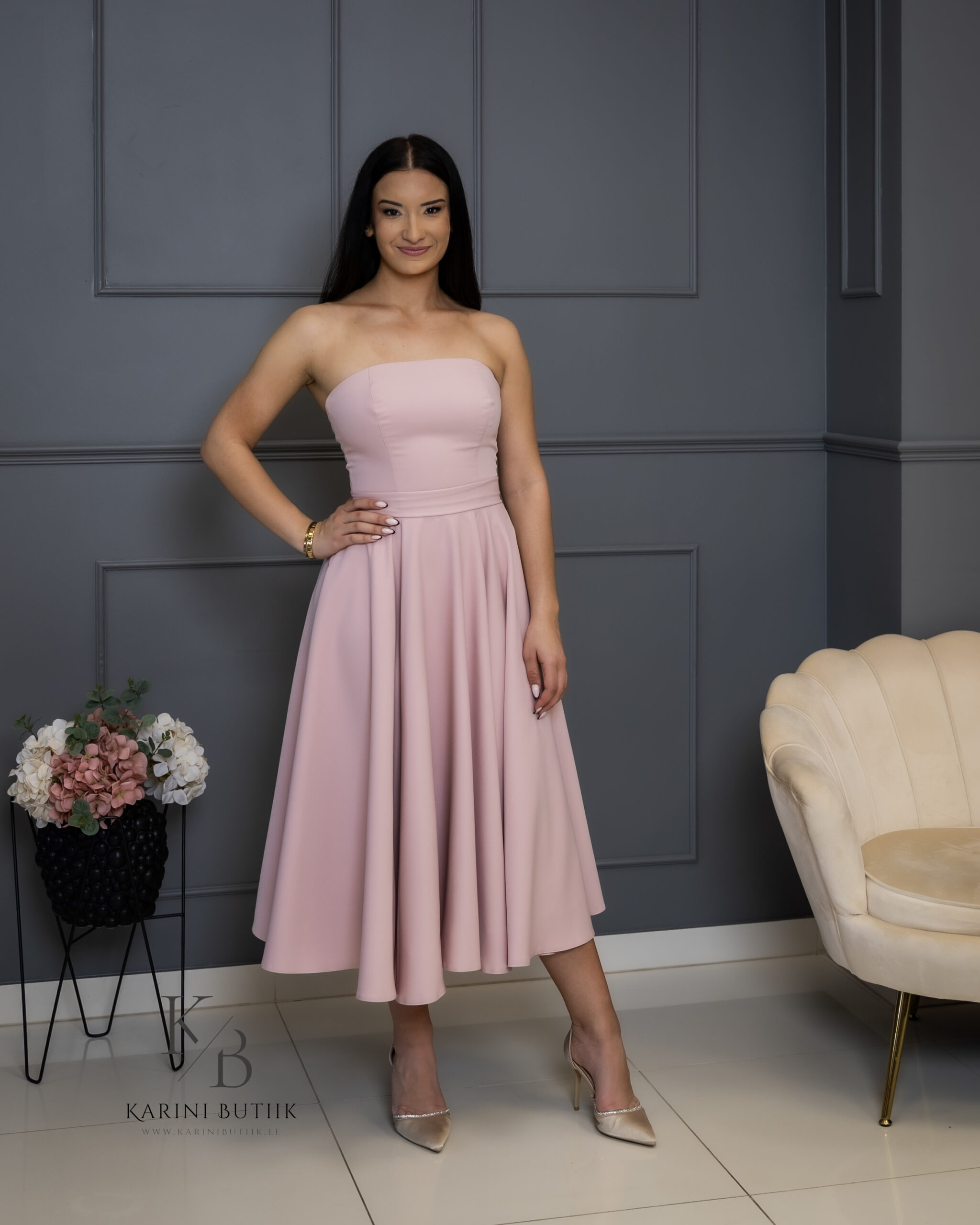 Karini Butiigi elegantne midikleit on naiselik ja pilkupüüdev valik pidulikuks sündmuseks, suvepeoks, lõpetamiseks või eriliseks tähistamiseks. Kleidil on kaunis figuuri rõhutav ülaosa, lendlev midi pikkuses seelik ning romantiline seljaosa korsetipaeltega, mis lisab kleidile luksusliku ja õrna aktsendi.