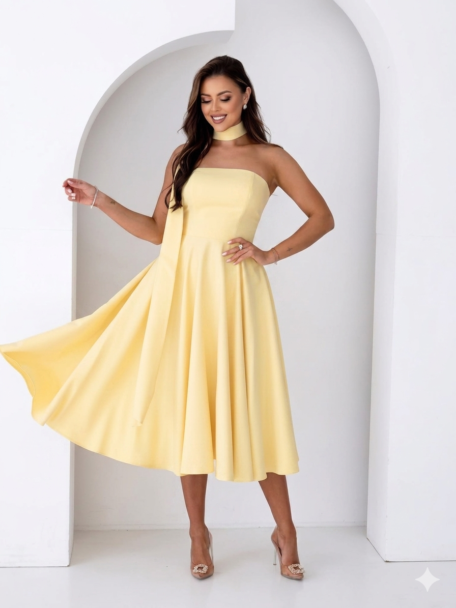 Midikleit on saadaval mitmes imeilusas toonis — kollane, helesinine, vanaroosa, barbieroosa ja fuksia. Suurused XXS, XS, S, M, L. Parima istuvuse jaoks soovitame valida üks suurus väiksem, kui tavaliselt kannad.