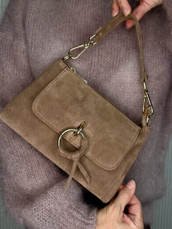 Elegantne ja praktiline käekott, valmistatud kvaliteetsest naturaalsest seemisnahast. Kott on kaunistatud stiilse metallist rõngasdetailiga ning sobib ideaalselt nii igapäevaseks kasutamiseks kui ka pidulikemaks sündmusteks. Komplektis on eemaldatav ja reguleeritava pikkusega õlarihm, mis võimaldab mugavalt kanda nii üle õla kui ka risti kehal. Pehme tekstuur ja ajatult šikk disain muudavad selle koti hooajast sõltumatuks lemmikuks.