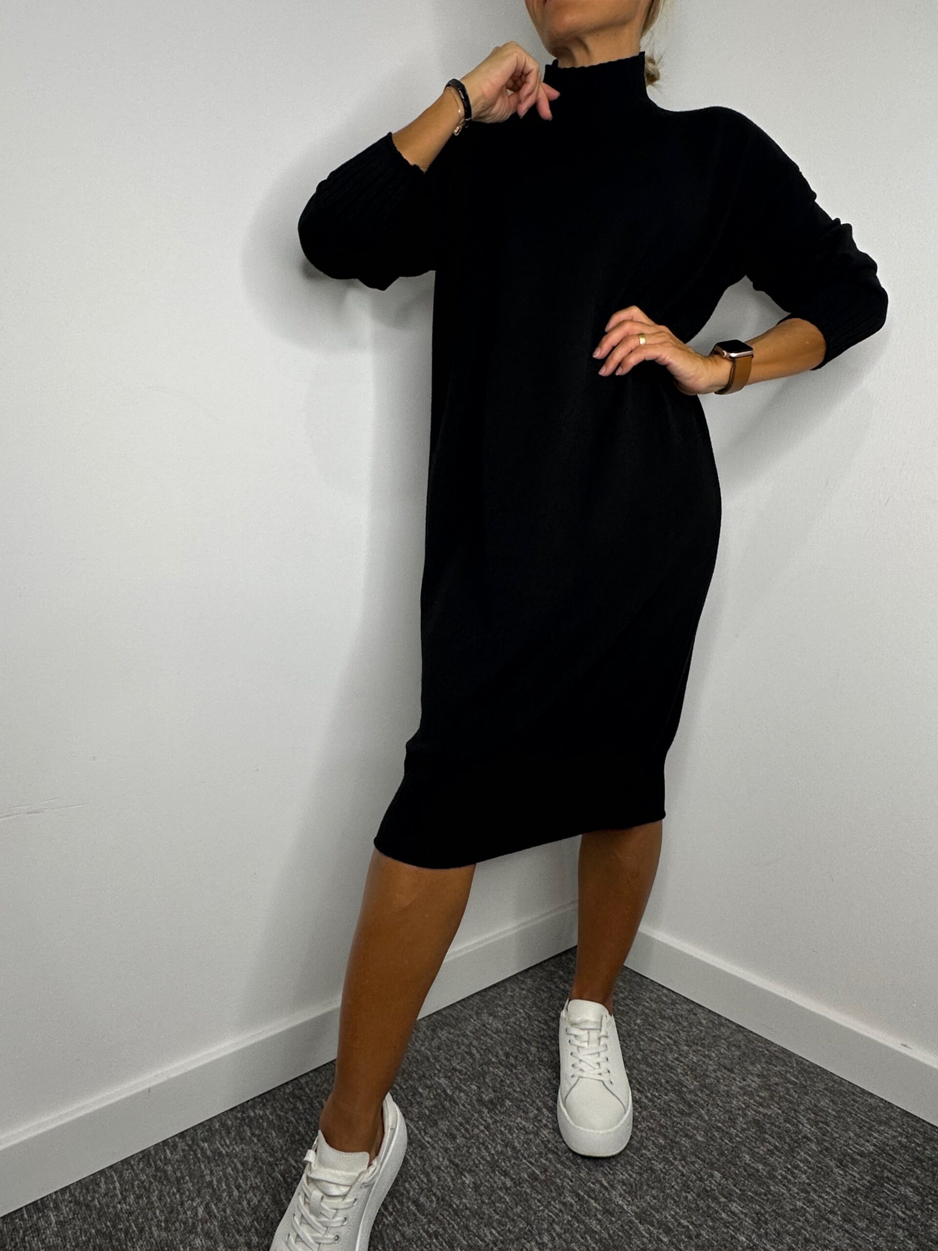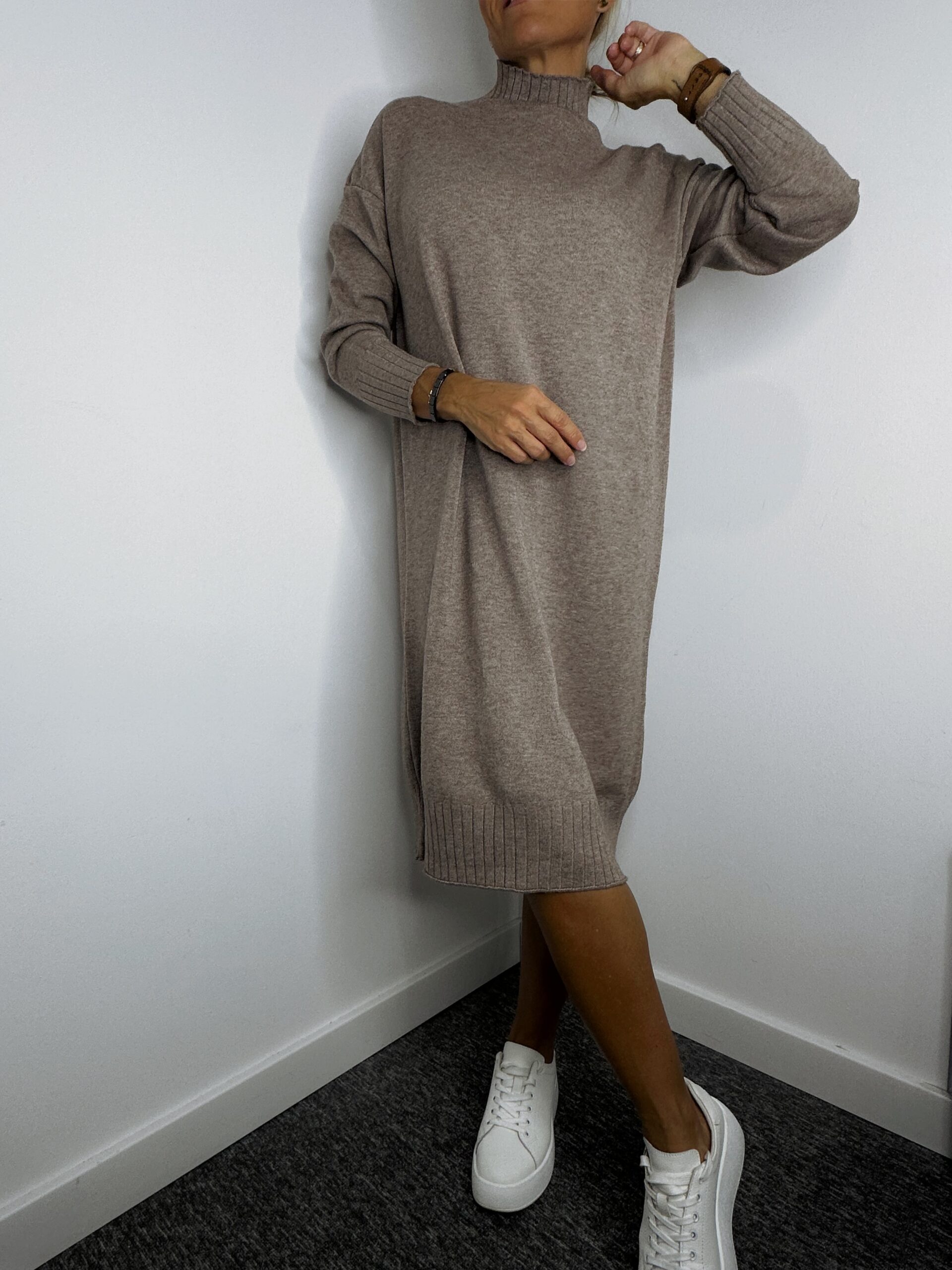 Kleit on valmistatud pehmest ja nahasõbralikust materjalist, mis sobib kandmiseks nii sügisel, talvel kui kevadel. Kõrgem kaelus, pikad varrukad ja kudumäärised varrukasuul ning allääres lisavad kleidile viimistletud ja kvaliteetse ilme.