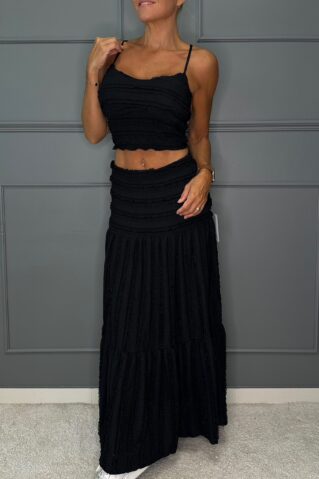 Romantiline ja naiselik kaheosaline komplekt, mis koosneb õhukesest rihmaga topist ja midipikkusest seelikust. Kangas on tekstuurne ja kergelt elastselt kroogitud, mis toob esile figuuri ja loob kauni, liikuva silueti. Seelikul on peenelt langev lõige, mis täiendab toppi ideaalselt ning sobib nii rannaõhtuteks, suvisteks jalutuskäikudeks kui ka linnastiili täiustamiseks. Saadaval neljas värvitoonis ja suurustes S/M ning M/L – mugav, kerge ja alati moekas valik.