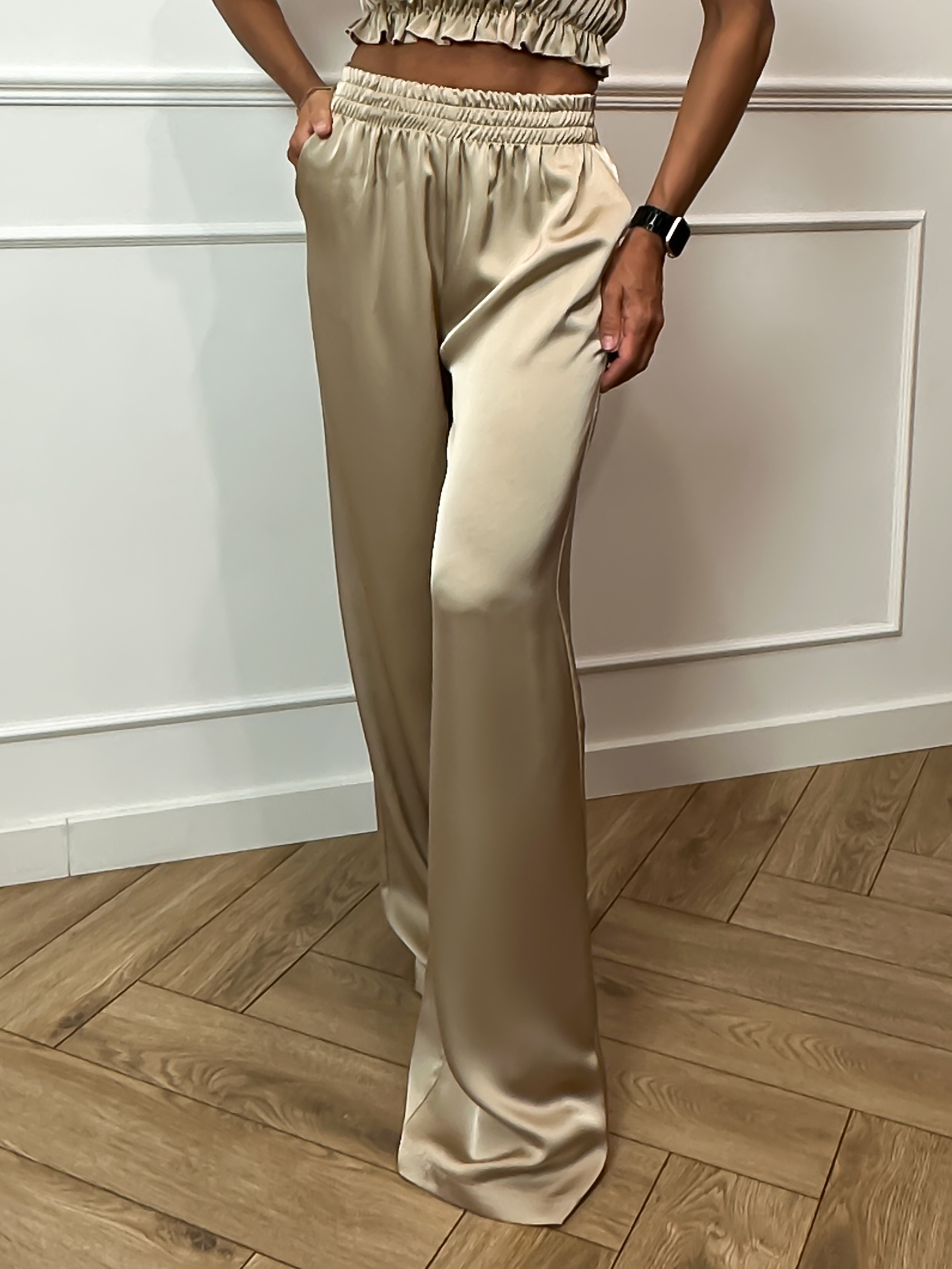 Tunne end mugavalt ja stiilselt kogu päeva jooksul meie satiinkangast vabalt langevate pükstega. Need püksid on valmistatud pehmest ja läikivast satiinist, mis lisab luksuslikku välimust ja tagab sujuva kandmise. Vabalt langev lõige pakub liikumisvabadust ja õhulist tunnetust, tehes need ideaalseks nii igapäevaseks kandmiseks kui ka erilisemateks sündmusteks. Taljeosas olev kumm tagab mugava ja paindliku istuvuse, samas kui praktilised taskud lisavad funktsionaalsust ja mugavust. Ühenda need püksid oma lemmikpluusi või -topiga, et luua elegantne ja kaasaegne välimus, mis sobib igaks olukorraks.