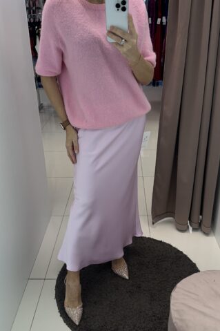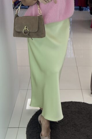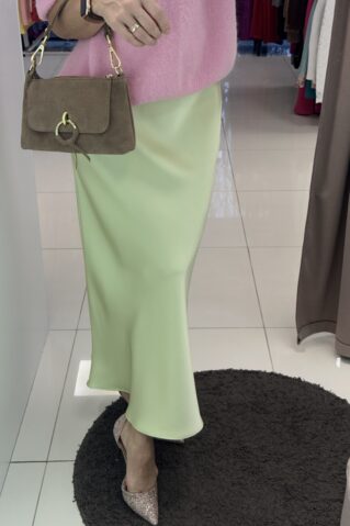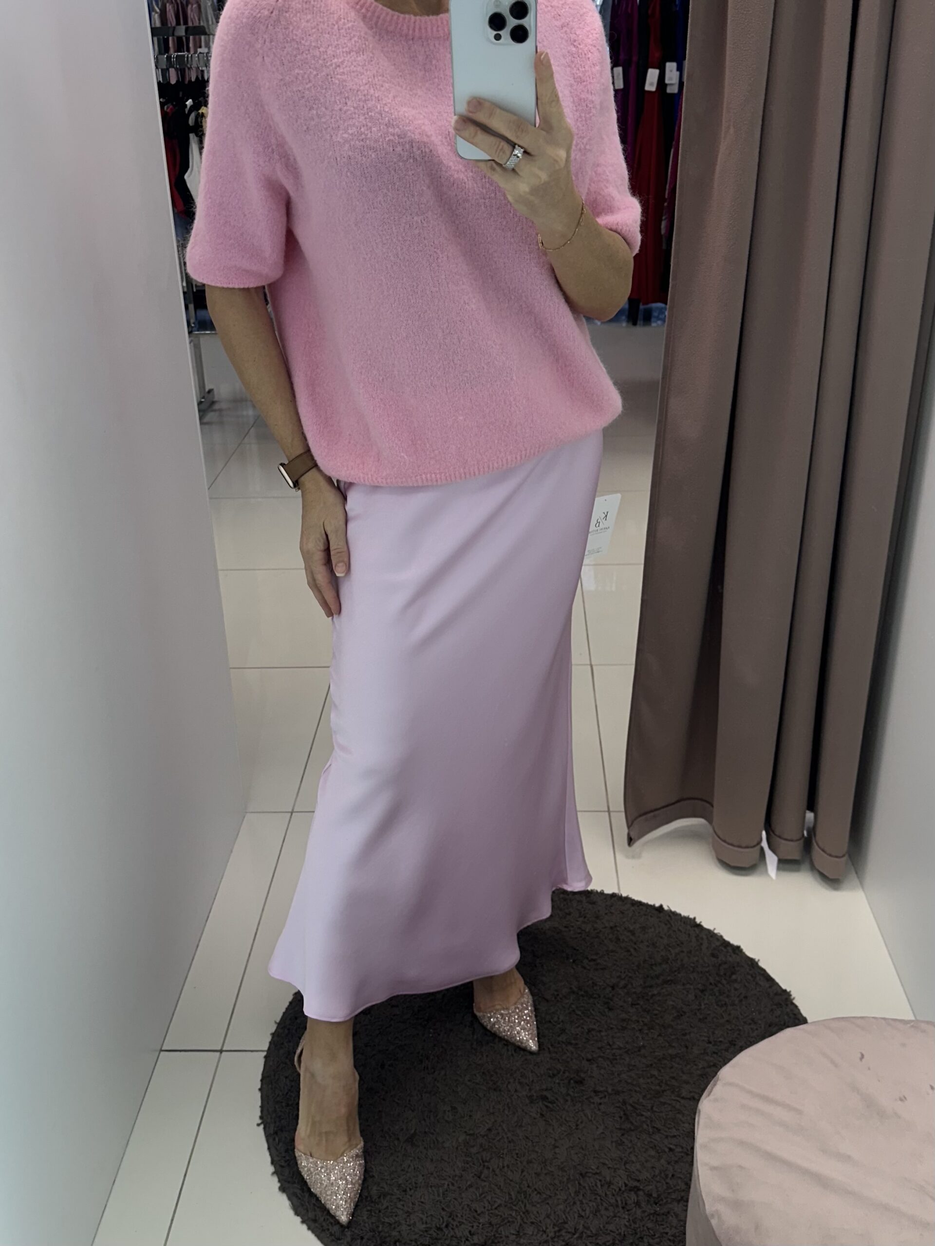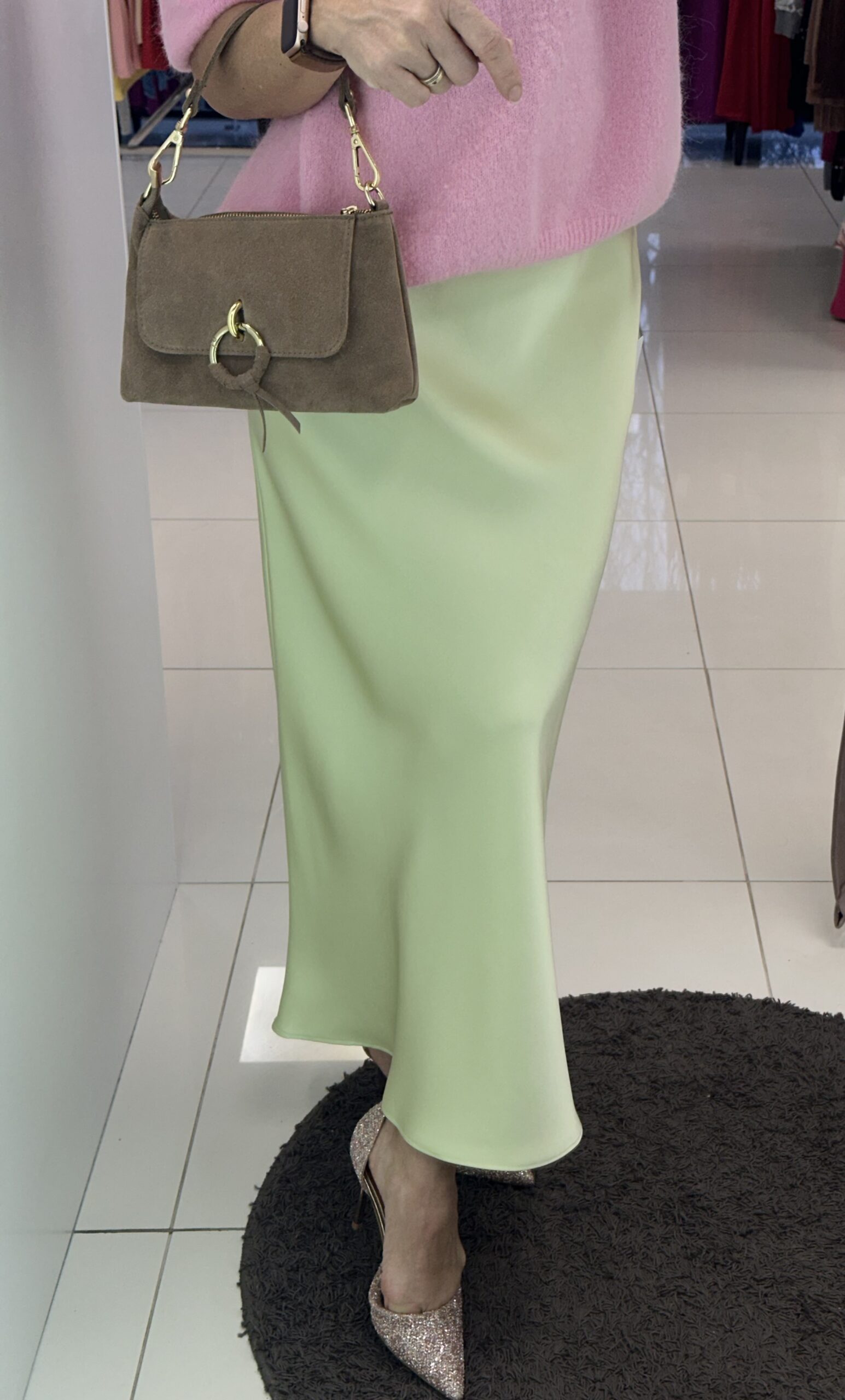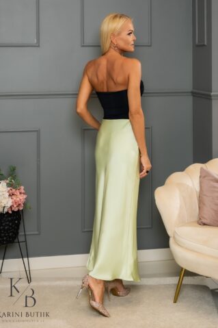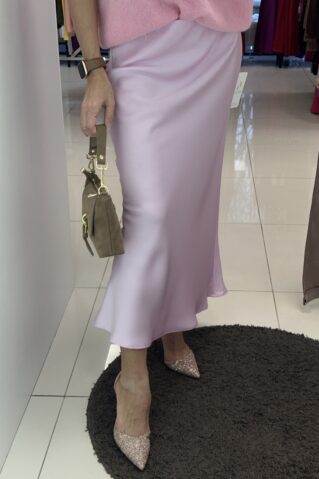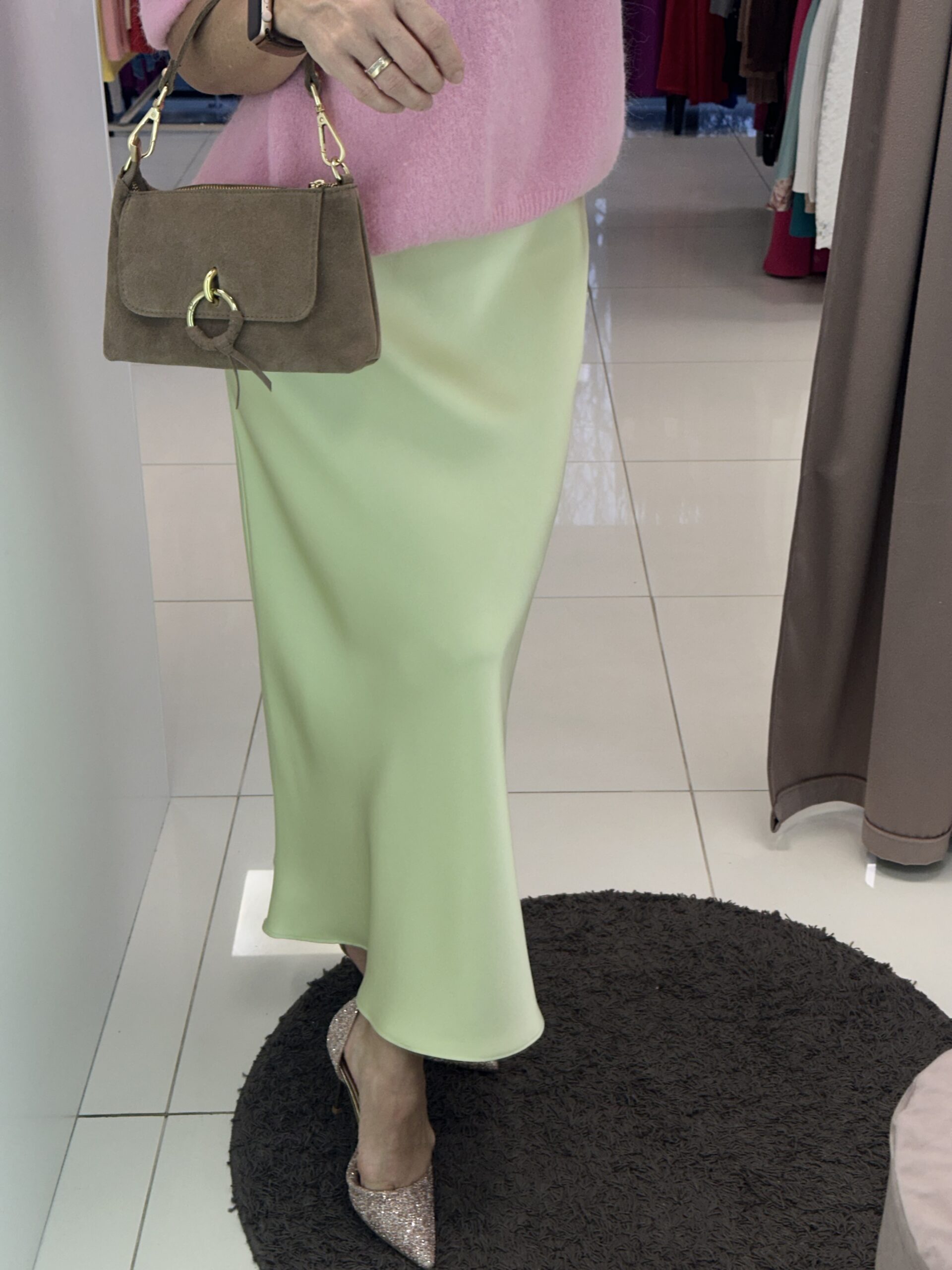 Seelik kerge läikega kangast, taljeosas kumm. Üldpikkus 90 cm