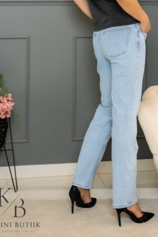 Ajatu stiiliga helesinised teksapüksid keskmise pihaga ja sirge lõikega – ideaalne valik pikemale kandjale. Need püksid loovad klassikalise ja puhta silueti, sobides hästi nii vabaaja- kui ka kontorilooks. Sirge lõige langeb loomulikult üle jalgade, pakkudes piisavalt liikumisvabadust ja tasakaalu mugavuse ning stiili vahel. Keskmine värvel toetab keskkohta ja sobib erinevatele kehatüüpidele. Valmistatud vastupidavast, kergelt venivast denim-kangast, mis säilitab oma vormi ja välimuse ka peale mitut kandmist.