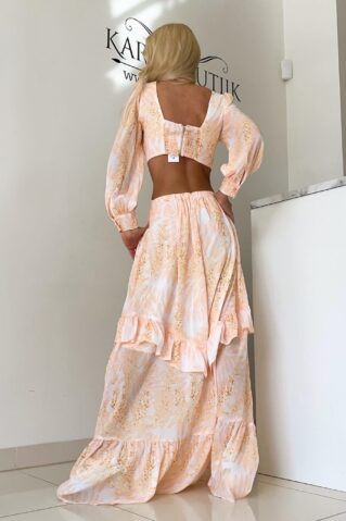Efektne kirju suvekleit, mis võlub oma maksipikkuse ja lendleva seelikuosaga. Kleit on pika varrukaga, mis lisab elegantset hõngu ja sobib kandmiseks nii päeval kui õhtul. Seljaosas asuv lai kummipael tagab mugava ja paindliku istuvuse, tuues esile kauni taljejoone. Ideaalne valik suveks, pakkudes nii stiili kui ka mugavust.