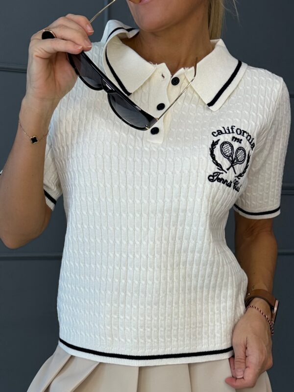 Elegantne ja sportlikku stiili ühendav naiste polosärk on loodud naisele, kes hindab mugavust ja trendikat välimust. Tekstuurse koega pehme kangas (60% viskoos, 30% polüamiid, 10% elastaan) on naha vastas mõnus, hingav ja elastne, tagades kauni istuvuse. Klassikaline krae, kontrastsed detailid ning dekoratiivne tikand lisavad pluusile eksklusiivset karakterit.