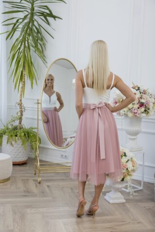 Elegantne midi pikkuses pidulik kleiti, mis on loodud eriliseks hetkeks säramiseks. Selle kleidi pealiskangas on valmistatud õrnast ja õhkõrnast tüllist, mis lisab igale liigutusele kergust ja võlu. Peenikesed õlapaelad annavad kleidile naiseliku ja delikaatse ilme, samas kui pihavöö rõhutab kaunilt taljet, luues täiusliku silueti. See kleit on ideaalne valik nii pidulikeks üritusteks kui ka erilise õhtu jaoks, pakkudes mugavust ja stiili üheskoos.