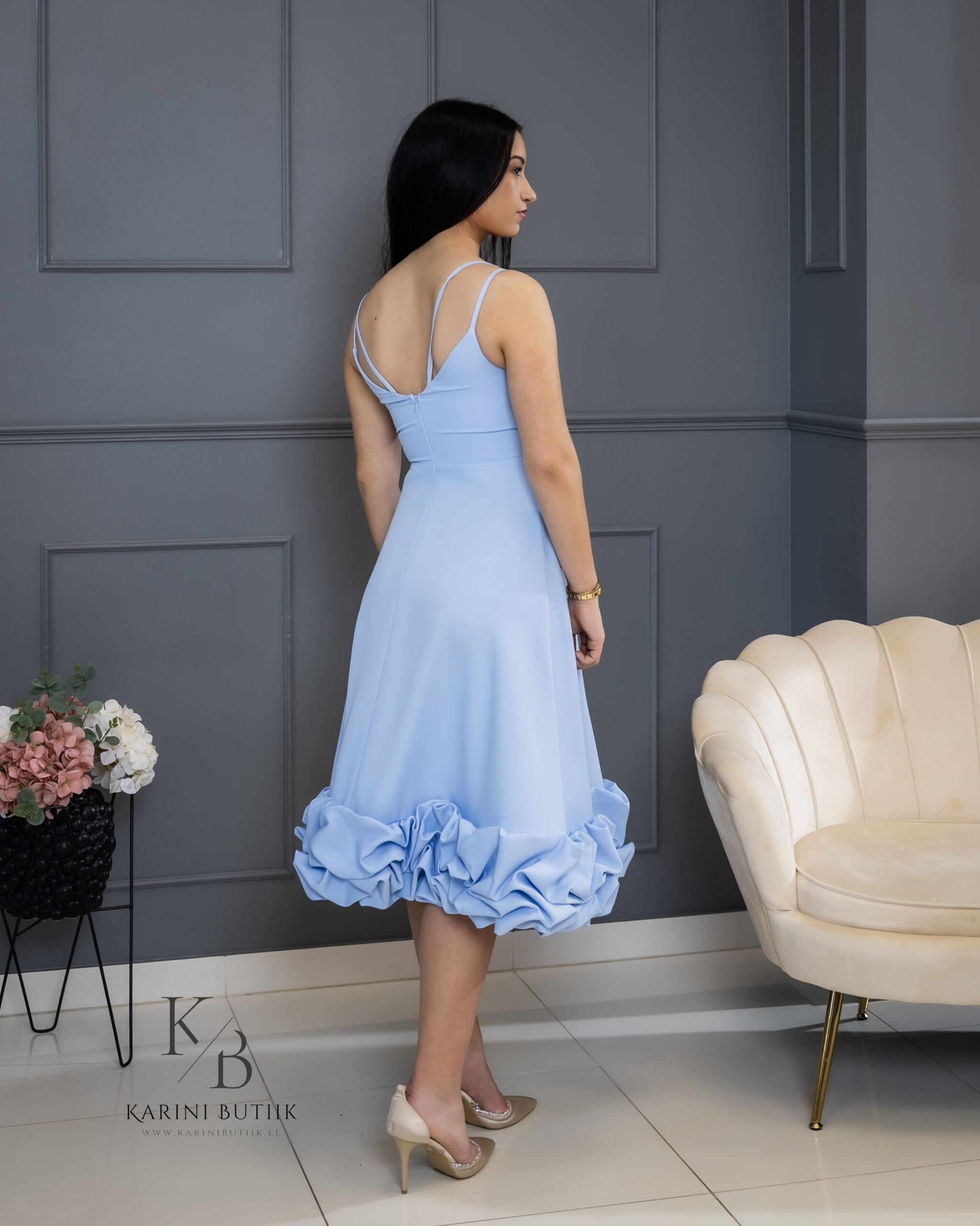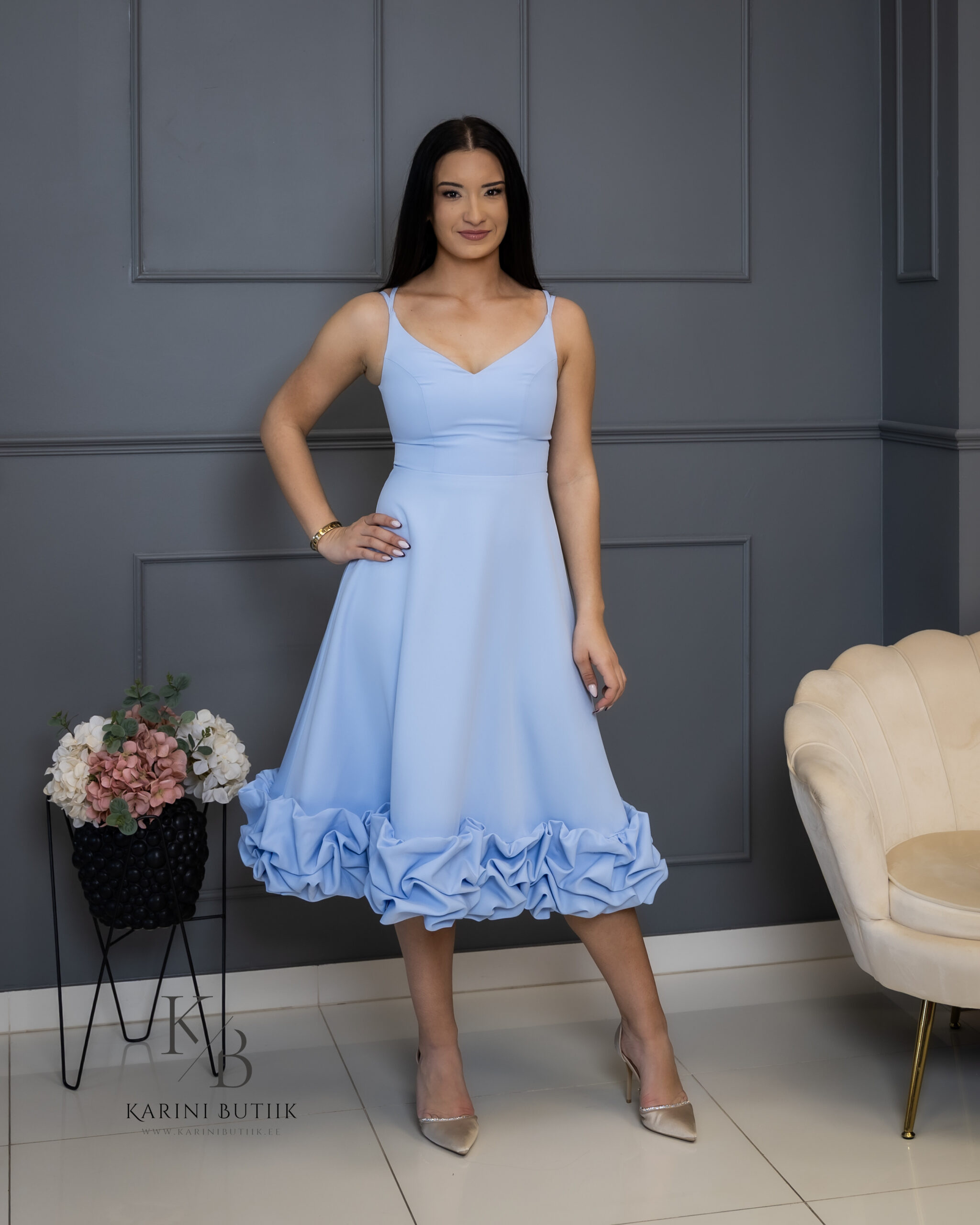 Karini Butiigi volangäärisega midikleit on naiselik, pilkupüüdev ja elegantne valik, mis sobib suurepäraselt pidulikeks sündmusteks, suvisteks üritusteks ja erilisteks hetkedeks. Kleidil on kaunis figuuri järgiv ülaosa, peened õlapaelad ning midi pikkuses langev seelikuosa, mida täiendab efektne ja luksuslik volangäär.
